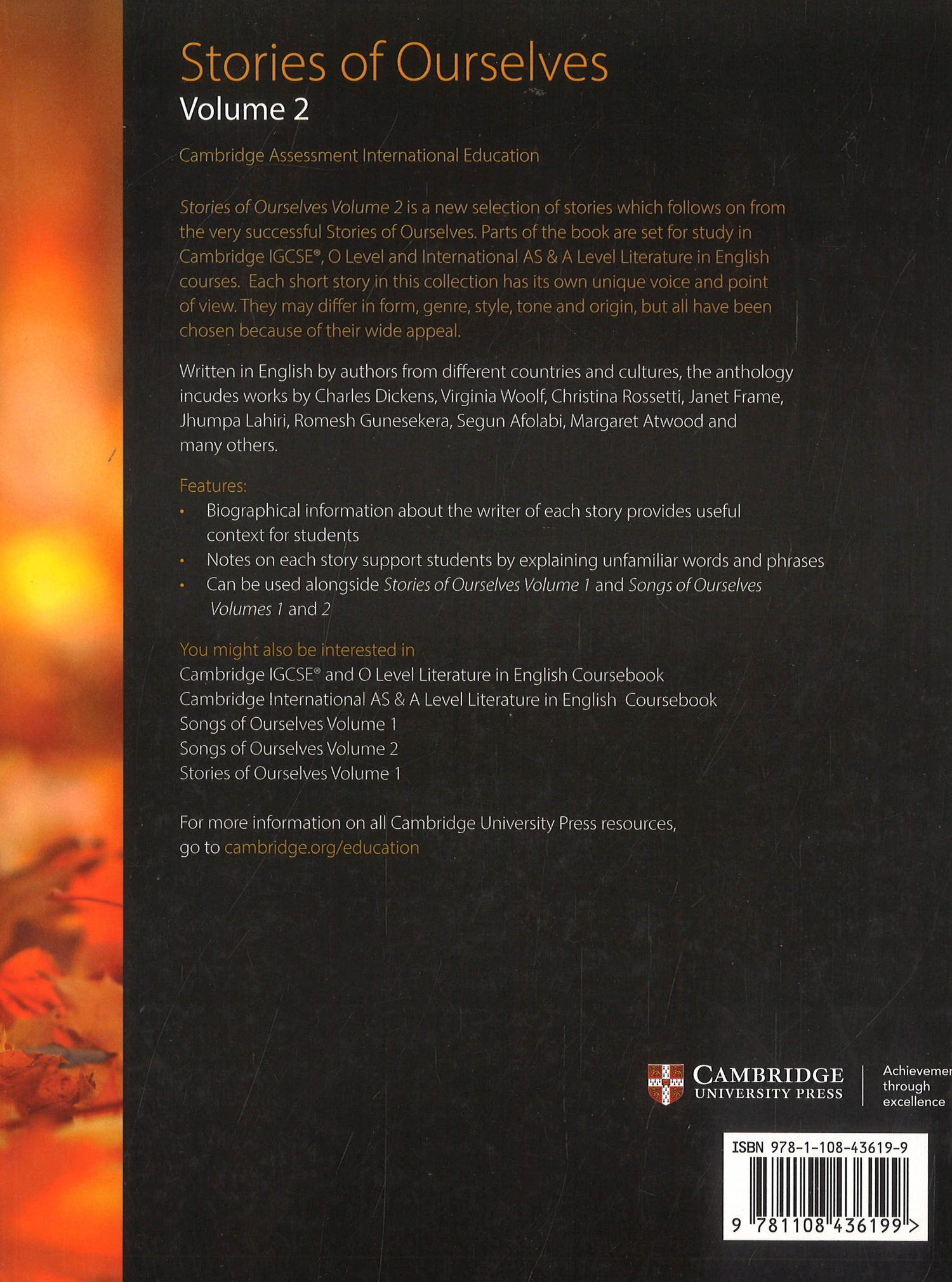 This series contains poetry and prose anthologies composed of writers from across the English-speaking world. Stories of Ourselves Volume 2 is a set text for Cambridge IGCSE (R), O Level and International AS & A Level Literature in English courses. The anthology contains short stories written in English by authors from many different countries and cultures, including Charles Dickens, Virginia Woolf, Christina Rossetti, Janet Frame, Jhumpa Lahiri, Romesh Gunesekera, Segun Afolabi, Margaret Atwood and many others. Classic writers appear alongside new voices from around the world in a stimulating collection with broad appeal.