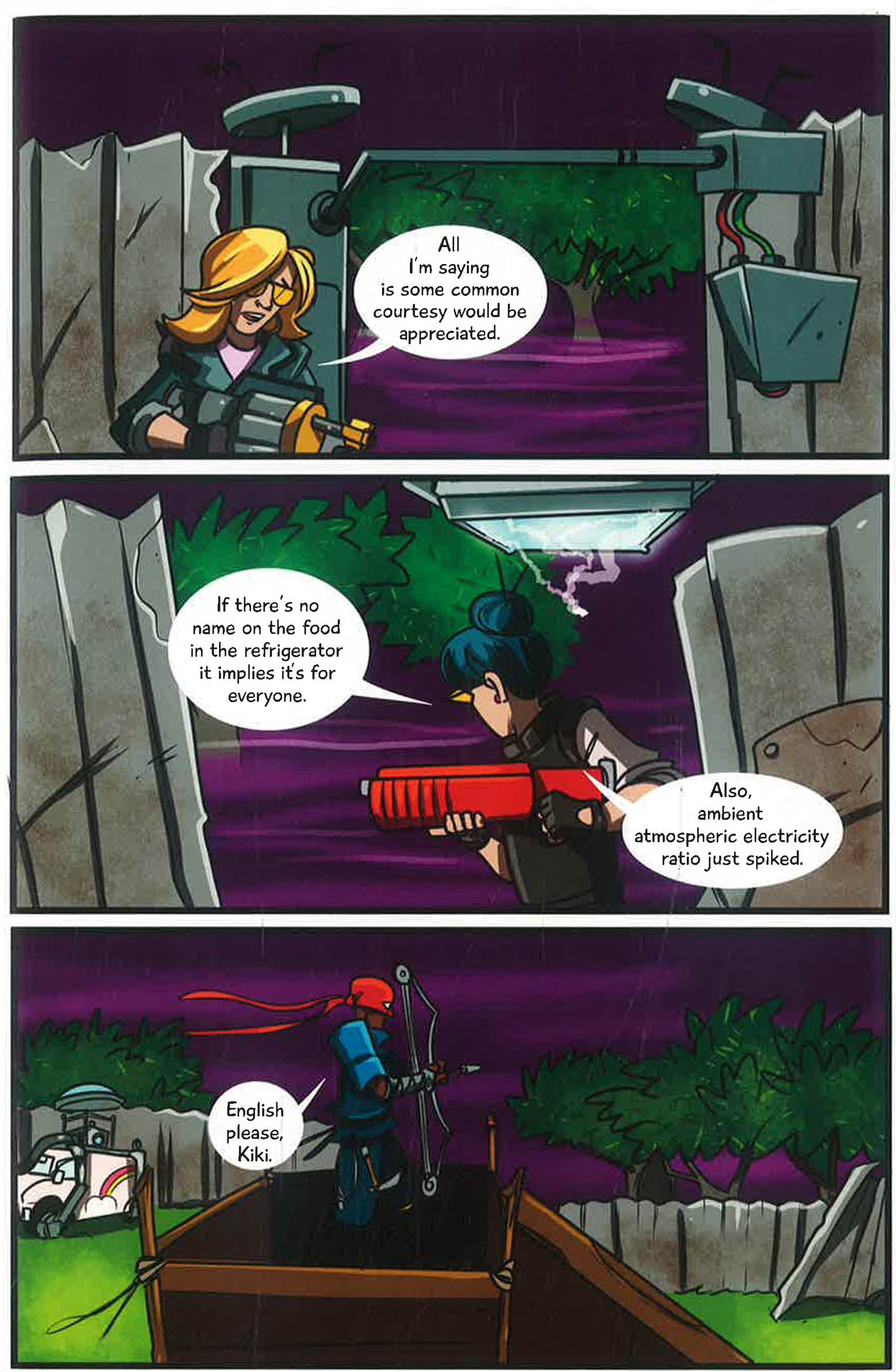Across the island, the Visitor operates a mysterious facility perched atop a volcano, where he’s building a massive robot. The New Omega leads her army of Secura-bots into Vindertech properties, looting technology. But the bad guys aren’t the only ones who’ve acquired new tech. Bravo Team has undergone a major upgrade and stand ready to slug it out wherever there’s a fight.