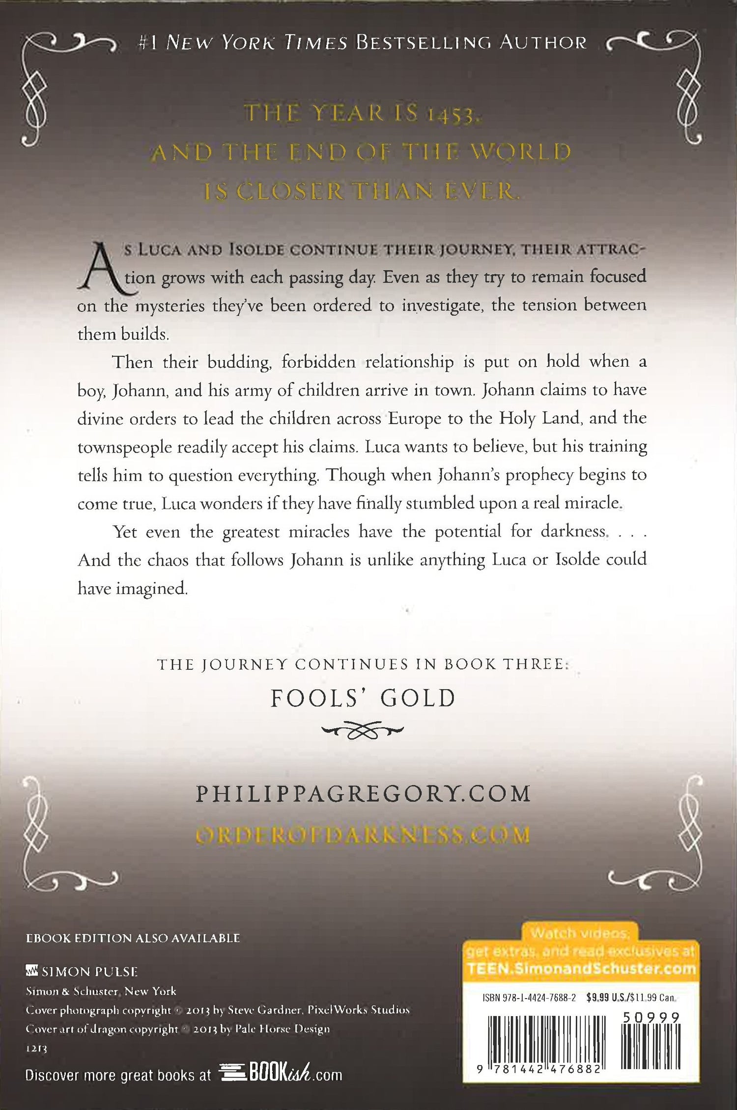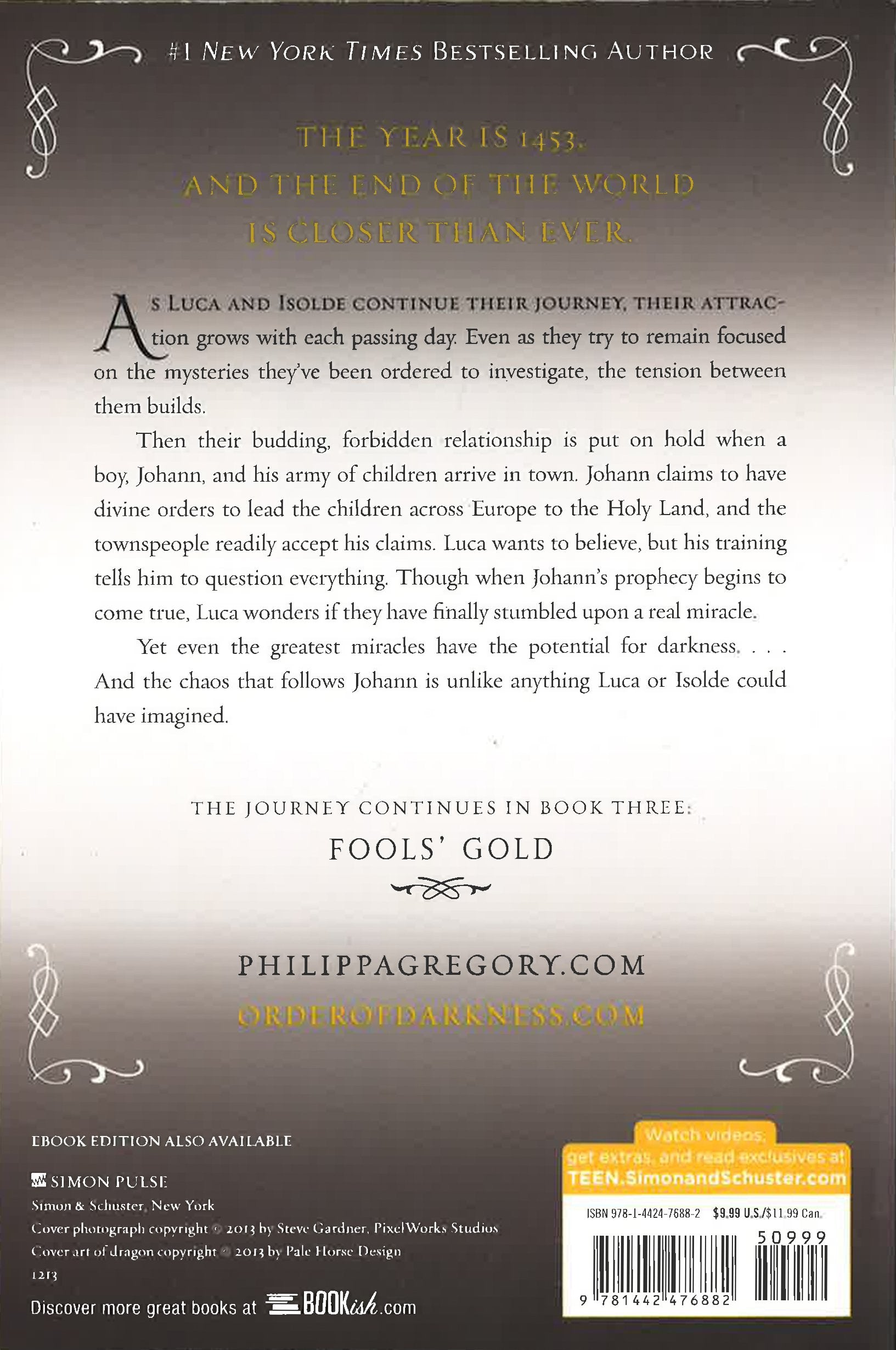 The second book in a YA quartet filled with intrigue, mystery, and romance, from #1 New York Times bestselling author Philippa Gregory. The year is 1453, and the end of the world is closer than ever. As Luca and Isolde continue their journey, their attraction grows with each passing day. Even as they try to remain focused on the mysteries they've been ordered to investigate, the tension between them builds. Their budding, illicit relationship is put on hold when a boy, Johann, and his army of children arrive in town. Johann claims to have divine orders to lead the children across Europe to the Holy Land, and the townspeople readily accept his claims. Luca wants to believe, but his training tells him to question everything...but when Johann's prophecy begins to come true, Luca wonders if they have finally stumbled upon a real miracle. Yet even the greatest miracles have the potential for darkness...and the chaos that follows Johann is unlike anything anyone could have imagined. The second in Philippa Gregory's four-book series delves further into a forbidden romance and an epic quest as secrets about The Order of Darkness are finally revealed...