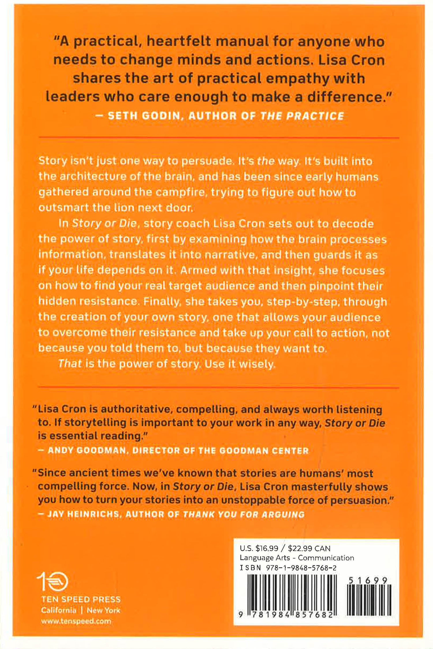 In Story or Die, story coach Lisa Cron sets out to decode the power of story, first by examining how the brain processes information, translates it into narrative, and then guards it as if your life depends on it. Armed with that insight, she focuses on how to find your real target audience and then pinpoint their hidden resistance. Finally, she takes you, step-by-step, through the creation of your own story, one that allows your audience to overcome their resistance and take up your call to action, not because you told them to, but because they want to.