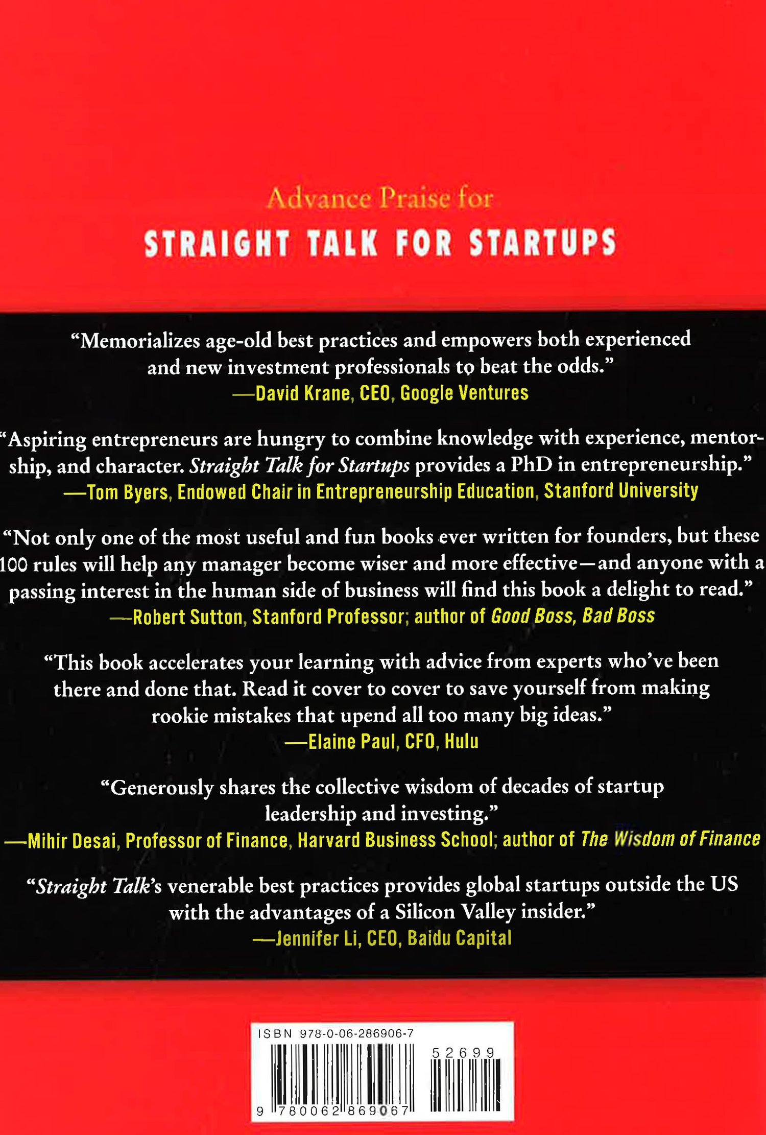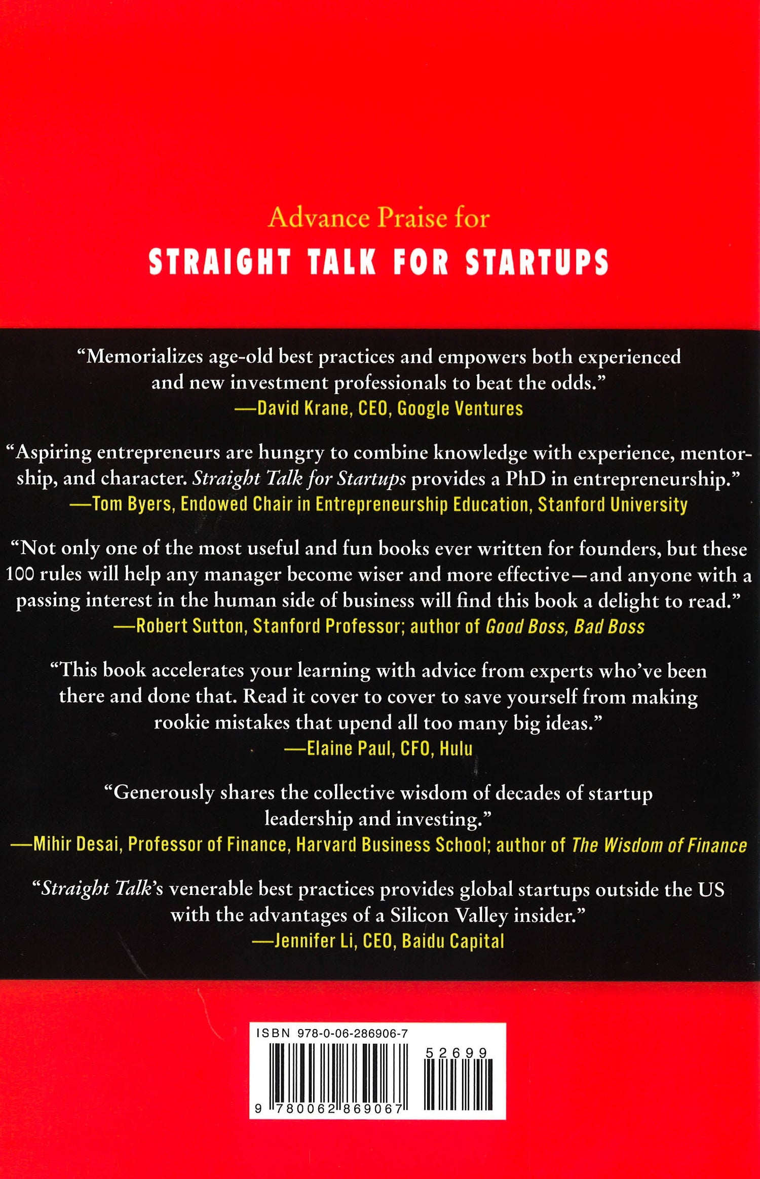 But, as Komisar and Reigersman show, you can beat the odds if you quickly learn what insiders know about what it takes to build a healthy foundation for a thriving venture. In Straight Talk for Startups they walk budding entrepreneurs through 100 essential rules-from pitching your idea to selecting investors to managing your board to deciding how and when to achieve liquidity. Culled from their own decades of experience, as well as the experiences of their many successful colleagues and friends, the rules are organized under broad topics, from "Mastering the Fundamentals" and "Selecting the Right Investors," to "The Ideal Fundraise," "Building and Managing Effective Boards," and "Achieving Liquidity."