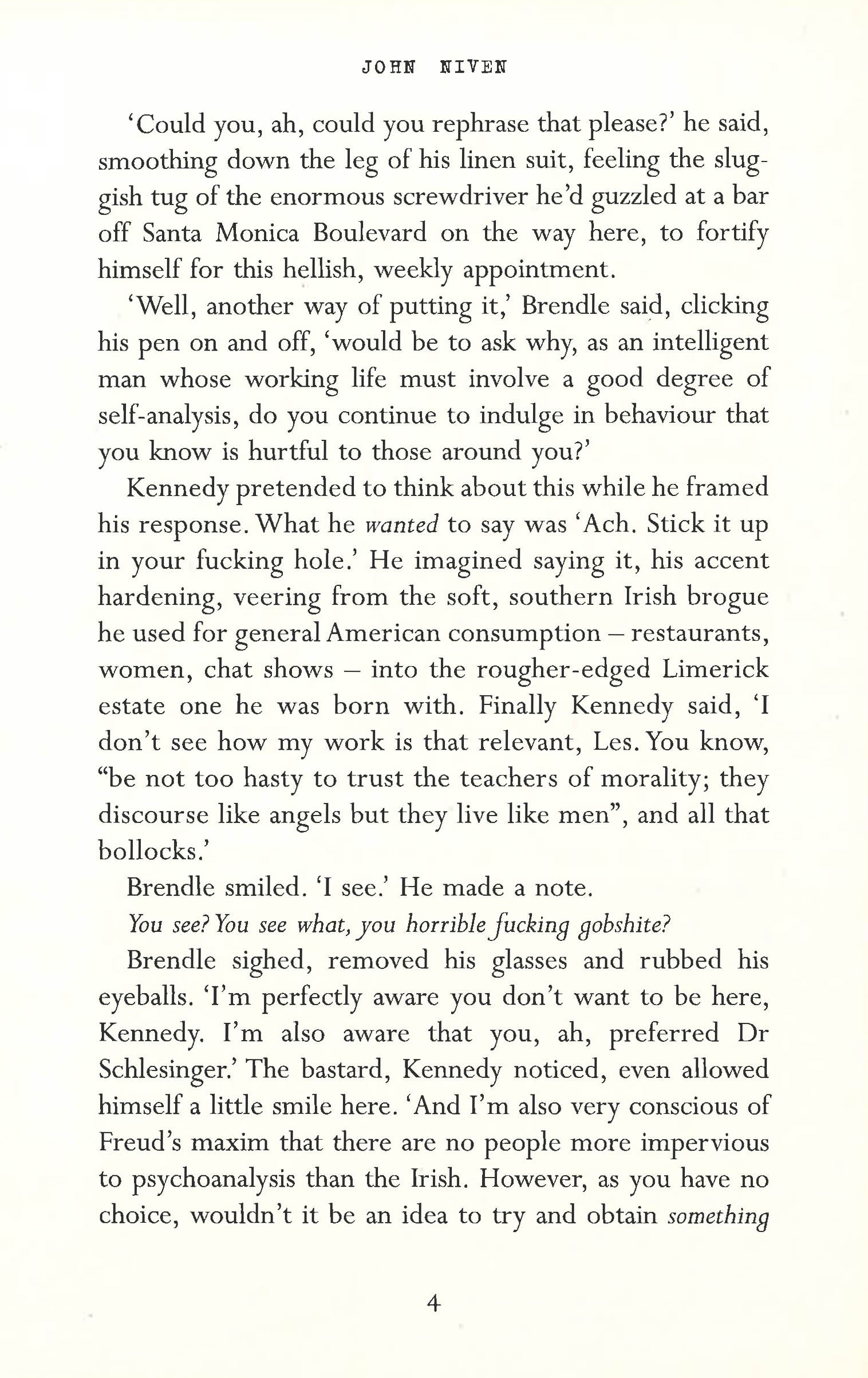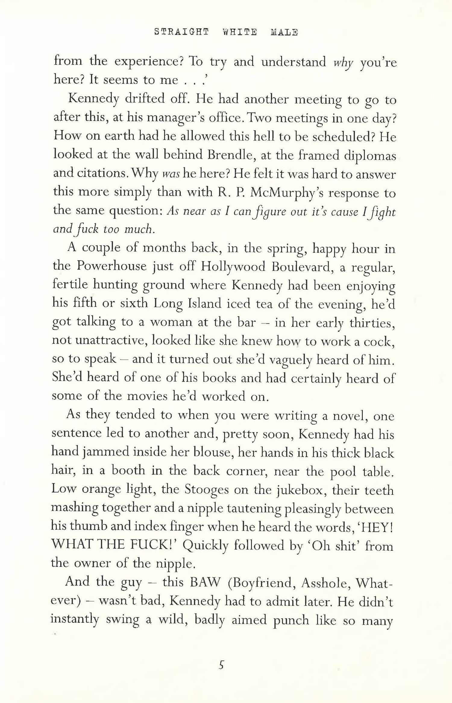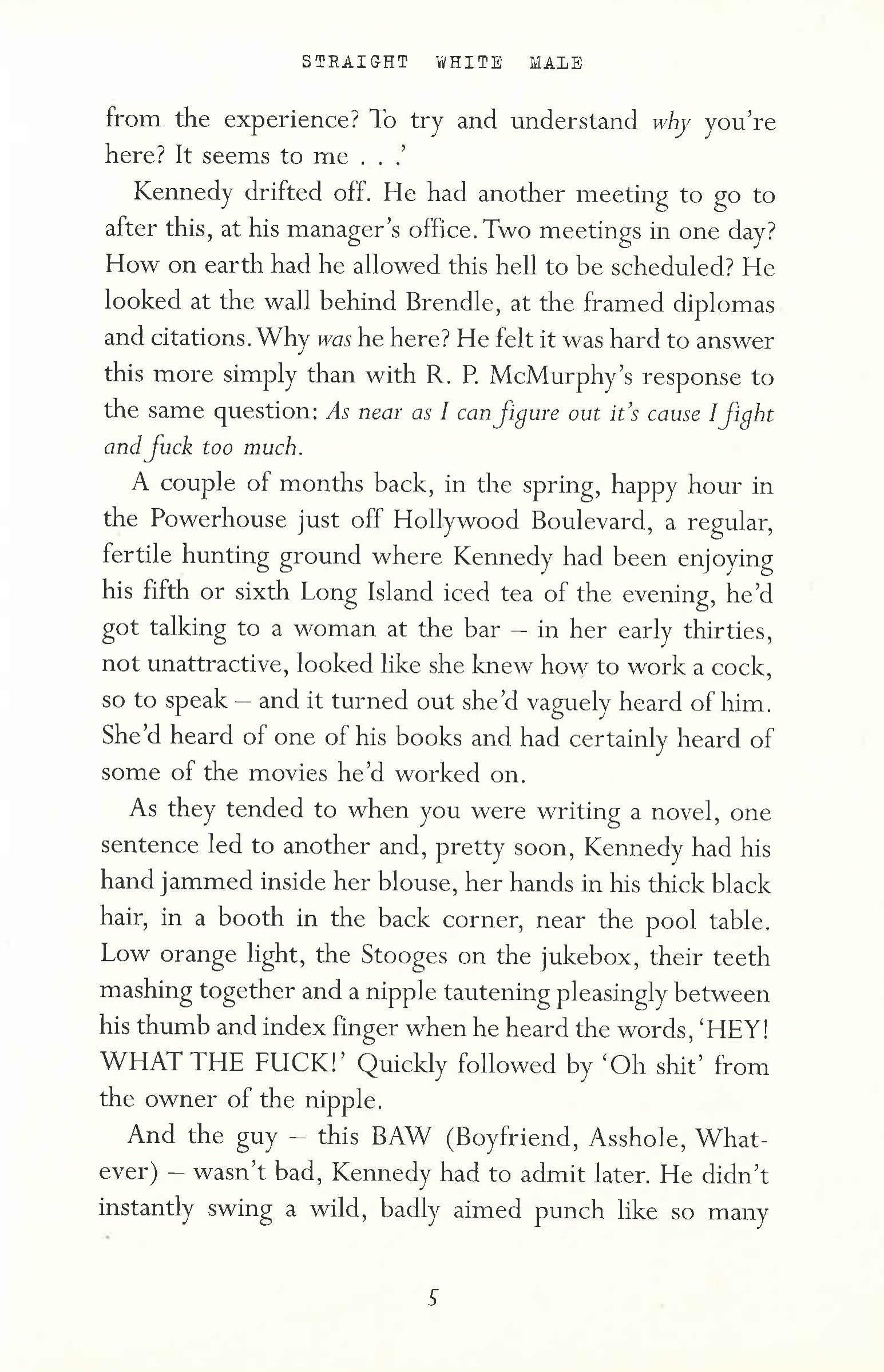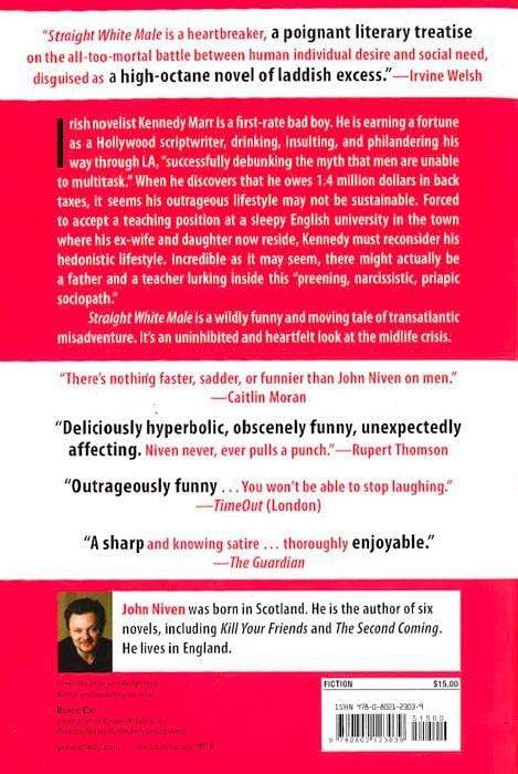 Irish novelist Kennedy Marr is a first rate bad boy. When he is not earning a fortune as one of Hollywood?s most sought after script writers, he is drinking, insulting and philandering his way through LA, ?successfully debunking the myth that men are unable to multitask?. He is loved by many women, but loathed by even more including ex-wives on both sides of the pond. Kennedy?s appetite for trouble is insatiable, but when he discovers that he owes 1.4 million dollars in back taxes, it seems his outrageous, hedonistic lifestyle may not be as sustainable as he thought. Forced to accept a teaching position at sleepy Deeping University, where his ex-wife and teenaged daughter now reside, Kennedy returns to England with a paper trail of tabloid headlines and scorned starlets hot on his bespoke heels. However, as he acclimatizes to the quaint campus Kennedy is forced to reconsider his laddish lifestyle. Incredible as it may seem, there might actually be a father and a teacher lurking inside this ?preening, narcissistic, priapic sociopath?. STRAIGHT WHITE MALE is a wildly funny and whip smart tale of Kennedy?s transatlantic misadventures. It?s an uninhibited and heartfelt look at the mid-life crisis of a lovable rogue.