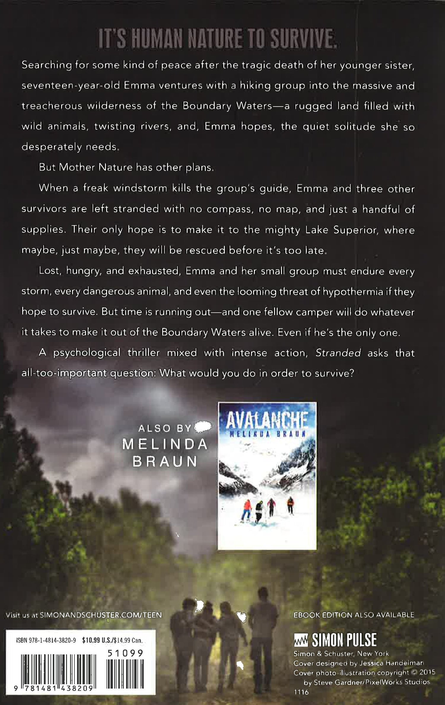 Plagued with guilt after surviving the car accident that took her sister’s life, Emma ventures into the rugged and mysterious wilderness of the Boundary Waters in search of some much needed peace. But when a freak windstorm kills her guide, Emma and a handful of other campers are forced to fend for themselves. Lost, hungry, and exhausted, the small group must rely on their survival instincts as they travel through the forest towards Lake Superior.But the Boundary Waters is vast and unpredictable, and as the days drag on, it becomes clear that the group is no match for what Mother Nature has in store - and time is running out.As they continue to battle the elements, Emma realizes that nature isn’t her only threat: there’s one camper who will do whatever it takes to make it out of the Boundary Waters alive. Even if he’s the only one . . .With ripped-from-the-headlines drama, this stirring story of heroism and survival will have you at the edge of your seat until the very last page.