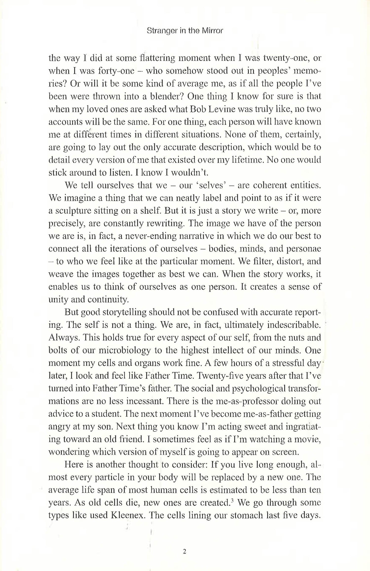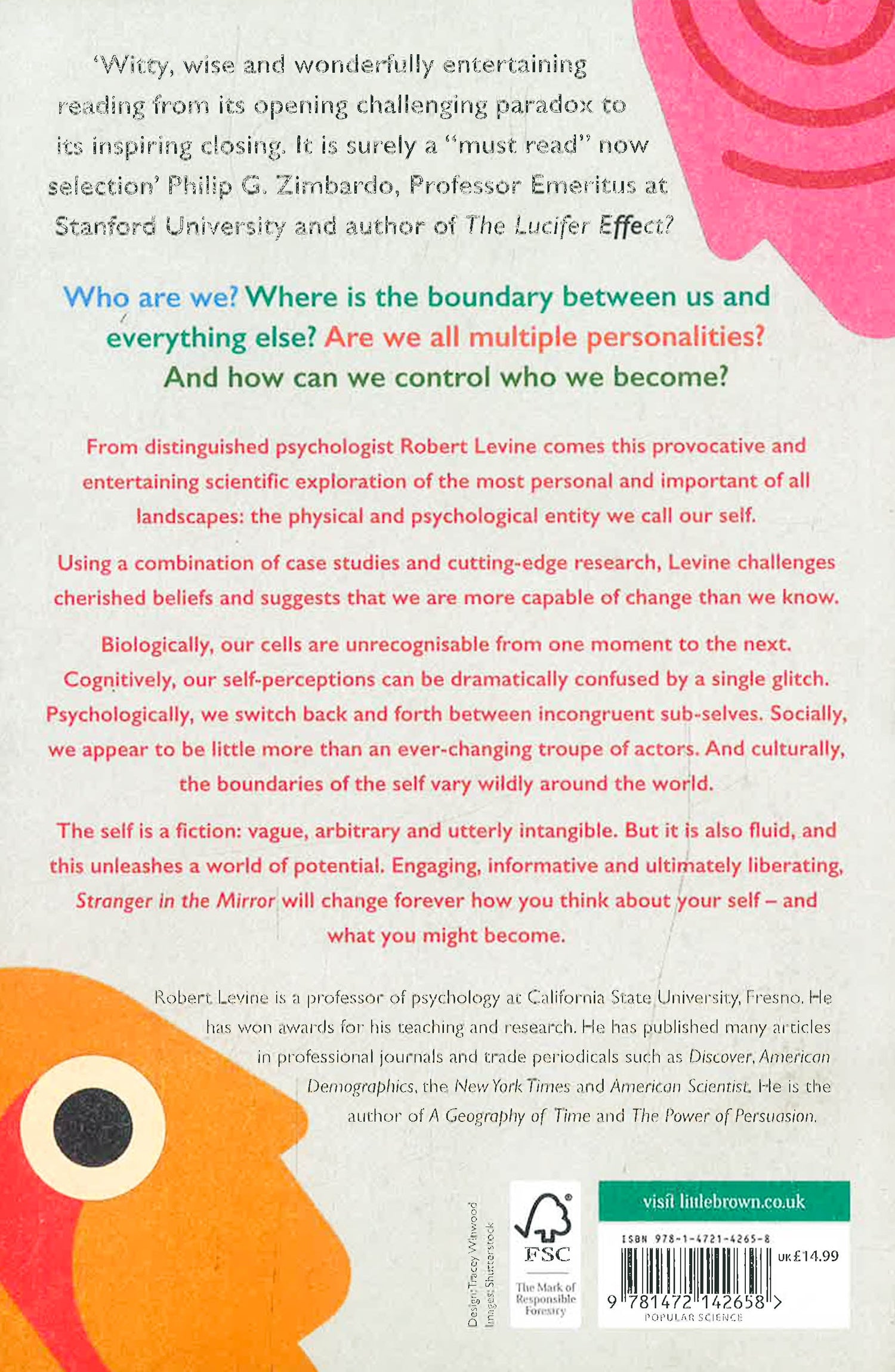 Who are we? Where is the boundary between us and everything else? Are we all multiple personalities? And how can we control who we become?From distinguished psychologist Robert Levine comes this provocative and entertaining scientific exploration of the most personal and important of all landscapes: the physical and psychological entity we call our self. Using a combination of case studies and cutting-edge research in psychology, biology, neuroscience, virtual reality and many other fields, Levine challenges cherished beliefs about the unity and stability of the self - but also suggests that we are more capable of change than we know. Transformation, Levine shows, is the human condition at virtually every level. Physically, our cells are unrecognizable from one moment to the next. Cognitively, our self-perceptions are equally changeable: A single glitch can make us lose track of a body part or our entire body, or to confuse our very self with that of another person. Psychologically, we switch back and forth like quicksilver between incongruent, sometimes adversarial sub-selves. Socially, we appear to be little more than an ever-changing troupe of actors. And, culturally, the boundaries of the self vary wildly around the world - from the confines of one's body to an entire village. The self, in short, is a fiction: vague, arbitrary, and utterly intangible. But it is also interminably fluid. And this unleashes a world of potential. Engaging, informative, and ultimately liberating, Stranger in the Mirror will change forever how you think about your self - and what you might become.