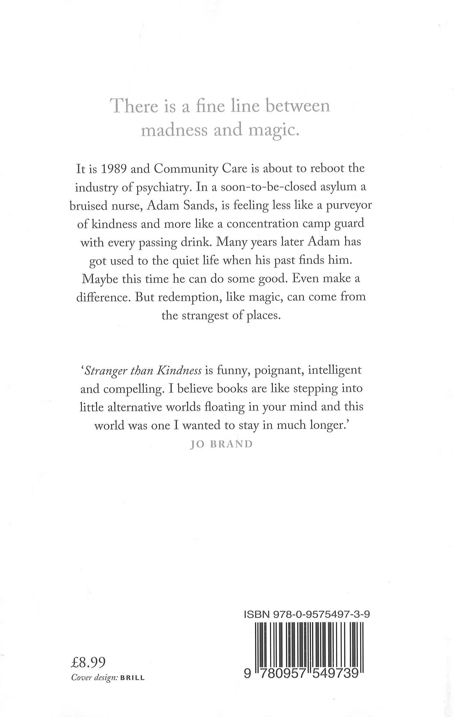 STRANGER THAN KINDNESS is funny, poignant, intelligent and compelling.I believe books are like stepping into little alternative worlds floating in your mind and this world was one I wanted to stay in much longer.' Jo Brand. It is 1989 and Community Care is about to reboot the industry of psychiatry. In a soon-to-be-closed asylum a bruised nurse, Adam Sands, is feeling less like a purveyor of kindness and more like a concentration camp guard with every passing drink. Many years later Adam has got used to the quiet life when his past finds him. Maybe this time he can do some good. Even make a diference. But redemption, like magic, can come from the strangest of places.