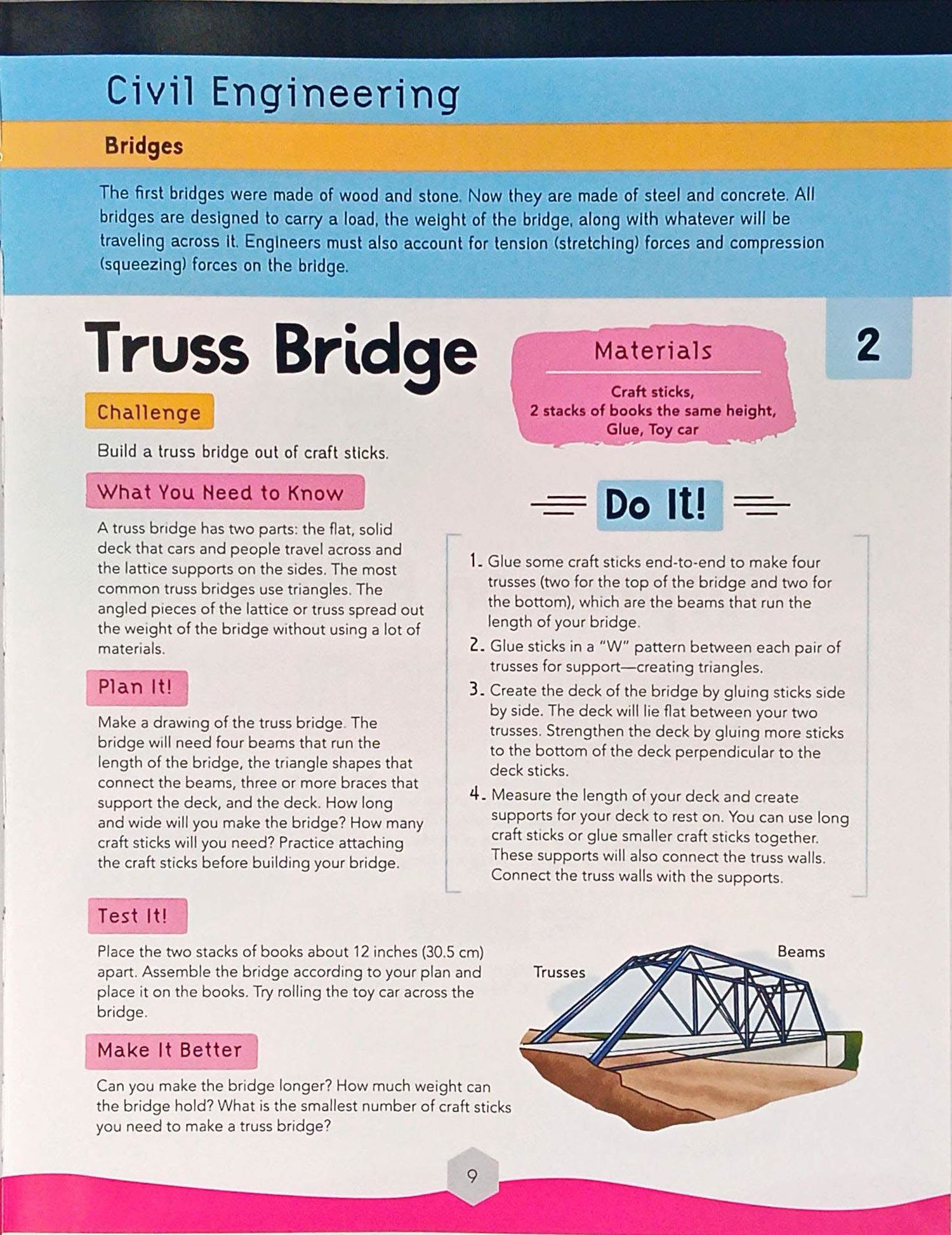 This learn-by-doing activity book provides 365 engineering challenges you can solve by thinking, tinkering, planning, and building. From craft-stick bridges, toothpick towers, and milk-jug igloos to drinking-straw rockets, cardboard boats, and rubber-band trampolines, there's something here for every budding engineer.