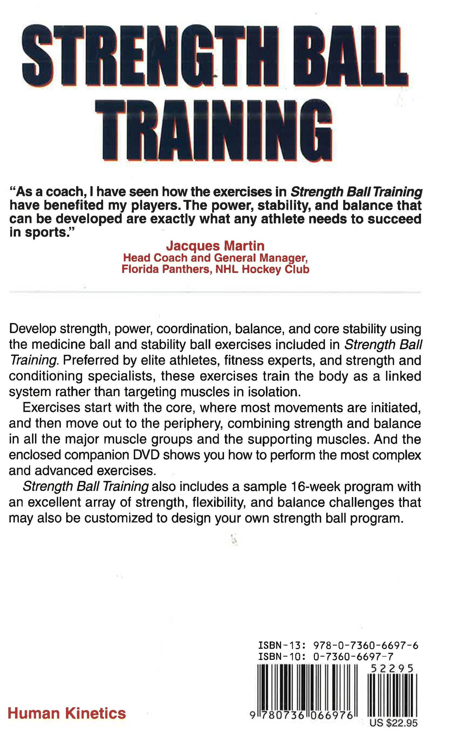 Develop strength, power, coordination, balance, and core stability using the medicine ball and stability ball exercises included in "Strength Ball Training". Preferred by elite athletes, fitness experts, and strength and conditioning specialists, these exercises train the body as a linked system rather than targeting muscles in isolation. Exercises start with the core, where most movements are initiated, and then move out to the periphery, combining strength and balance in all the major muscle groups and the supporting muscles. And the enclosed companion DVD shows you how to perform the most complex and advanced exercises. "Strength Ball Training" also includes a sample 16-week program with an excellent array of strength, flexibility, and balance challenges that may also be customized to design your own strength ball program.