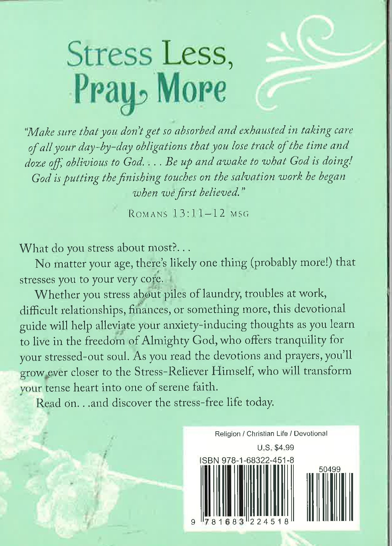This brand-new devotional guide features 180 readings and prayers designed to help alleviate your stresses as you learn to live in the freedom of Almighty God, who offers tranquility for your stressed-out soul. Inspired by this promise from God's Word: "Make sure that you don't get so absorbed and exhausted in taking care of all your day-by-day obligations that you lose track of the time and doze off, oblivious to God. . . . Be up and awake to what God is doing! God is putting the finishing touches on the salvation work he began when we first believed." (Romans 13:11-12 MSG), Stress Less, Pray More reinforces the truth that with God, you can live stress-free every single day--whether you stress over piles of laundry, troubles at work, difficult relationships, finances, or something more.