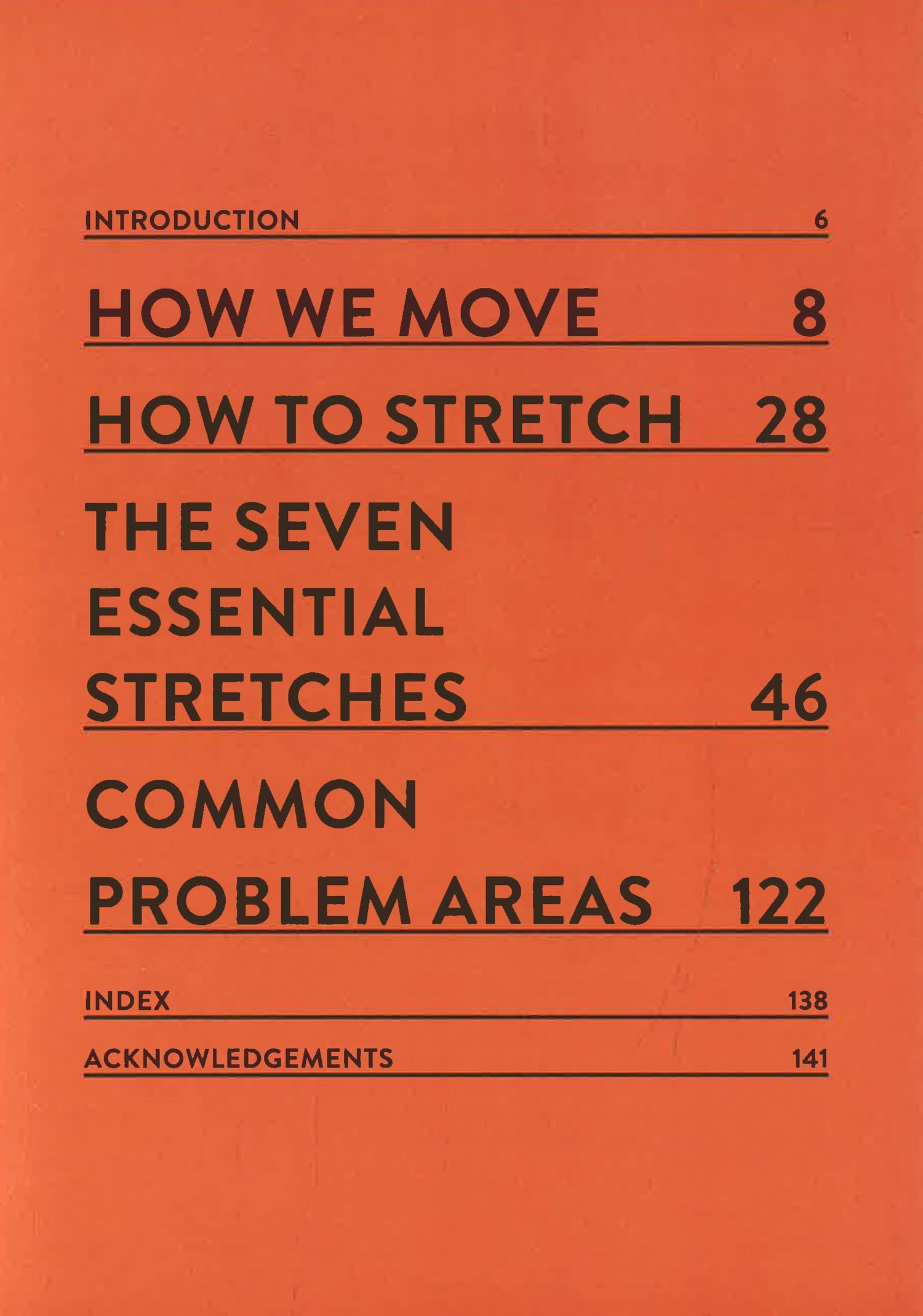 Life in chairs causes muscles and joints to slowly tighten. Mobility and flexibility should become a habit that gets done every day. STRETCH outlines a daily program of seven simple stretches (with three variations of each) staggered throughout the working day, making it easier than ever to combat the common aches and pains of working from home.