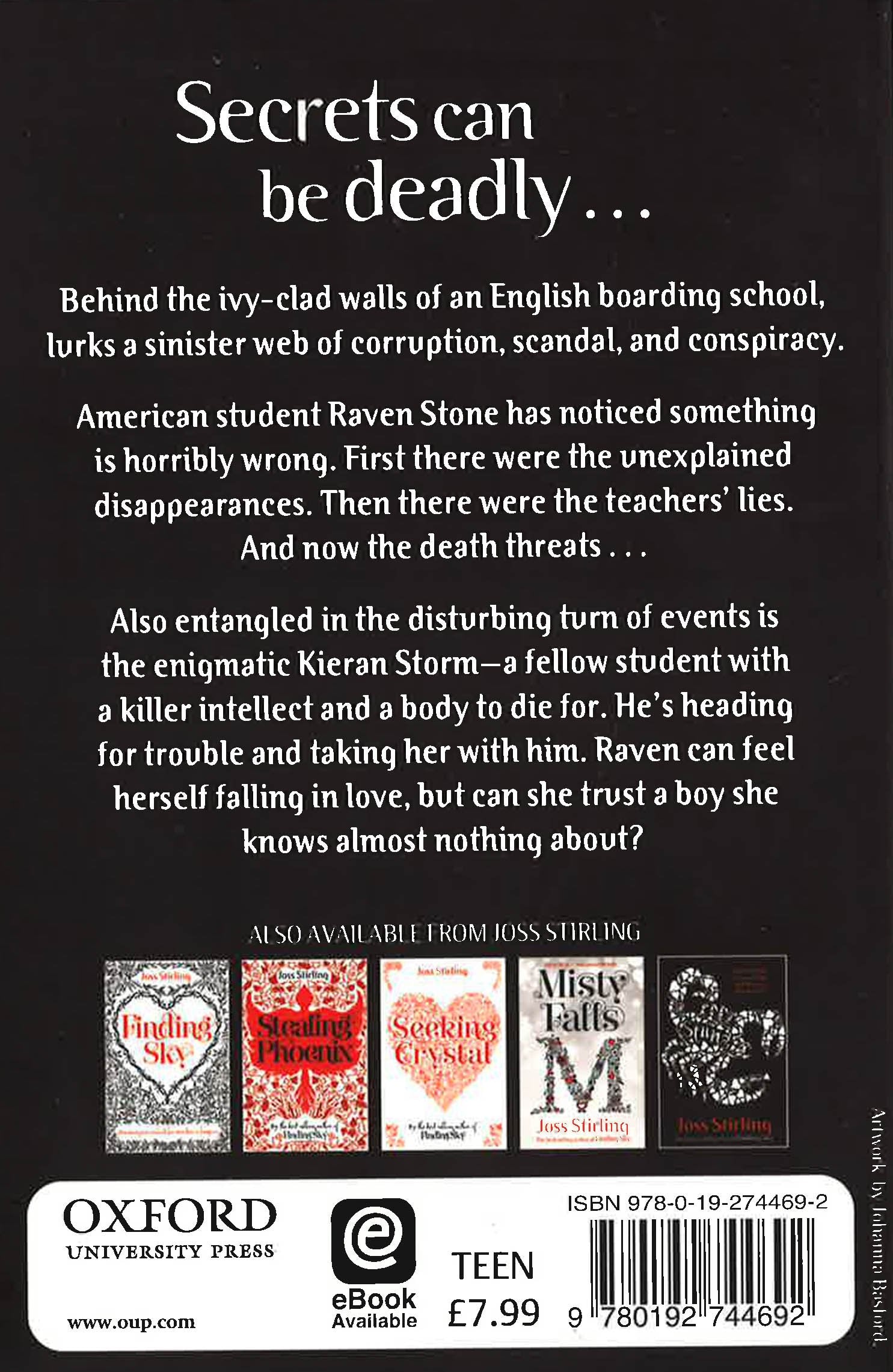 Behind the ivy-clad walls of an exclusive boarding school, lurks a sinister web of corruption, scandal, and conspiracy. American student Raven Stone has noticed something is horribly wrong. First there were the unexplained disappearances. Then there were the teachers' lies. And now the death threats . . . Also entangled in the disturbing turn of events is the enigmatic Kieran Storm - a fellow student with a killer intellect and a body to die for. He's heading for trouble and taking her with him. Raven can feel herself falling in love, but can she trust a boy she knows almost nothing about?