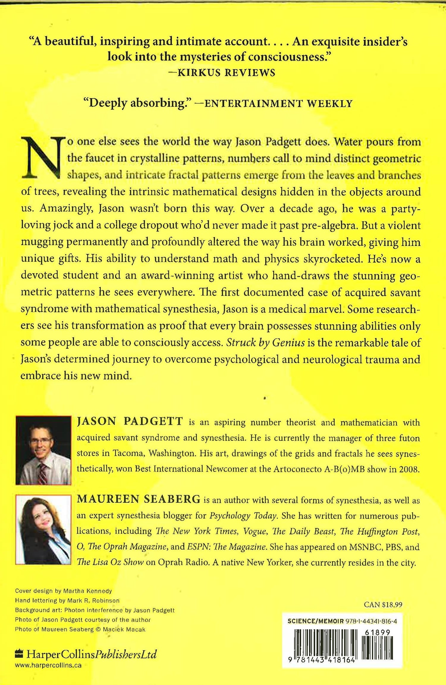 No one sees the world quite the way Jason Padgett does: Water pours from the faucet in crystalline patterns. Each number has a distinct geometric shape. Fractal patterns emerge from the movement of tree branches and the swirl of cream in his coffee. The objects around him reveal their hidden mathematical patterns.The amazing thing is that Jason wasn’t born this way. Twelve years ago, he was an ordinary guy, a jock who loved to party and who hadn't made it past pre-algebra in high school. One night, a vicious blow to the head in an altercation profoundly and permanently changed the way his brain worked. Jason would eventually learn that his injury had made him an acquired savant and a synesthete - someone whose blended sense perception causes such strange effects as the ability to taste shapes, to hear colours and to see numbers as geometric objects. Suddenly Jason saw the world in a completely different way. As the first documented case of acquired savant syndrome with his particular type of mathematical synesthesia, he is a medical marvel.Struck by Genius recounts how Padgett overcame enormous setbacks and embraced his transformed mind. Along the way he found love, discovered joy in numbers and spent plenty of time having his head examined. This fascinating and inspiring story about the abilities that lie hidden within all of us reveals how much we still have to learn about the wondrous potential of the human brain.