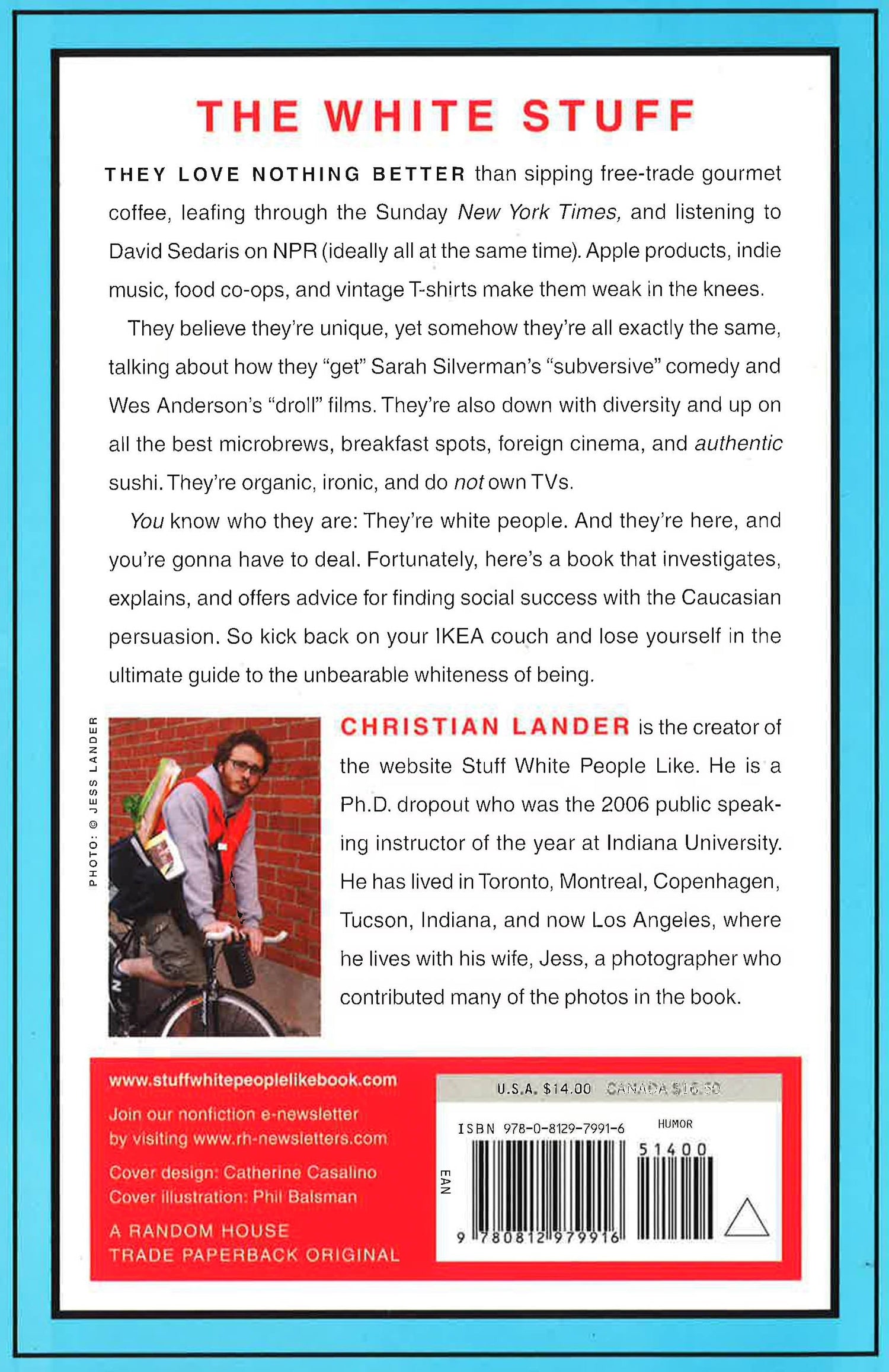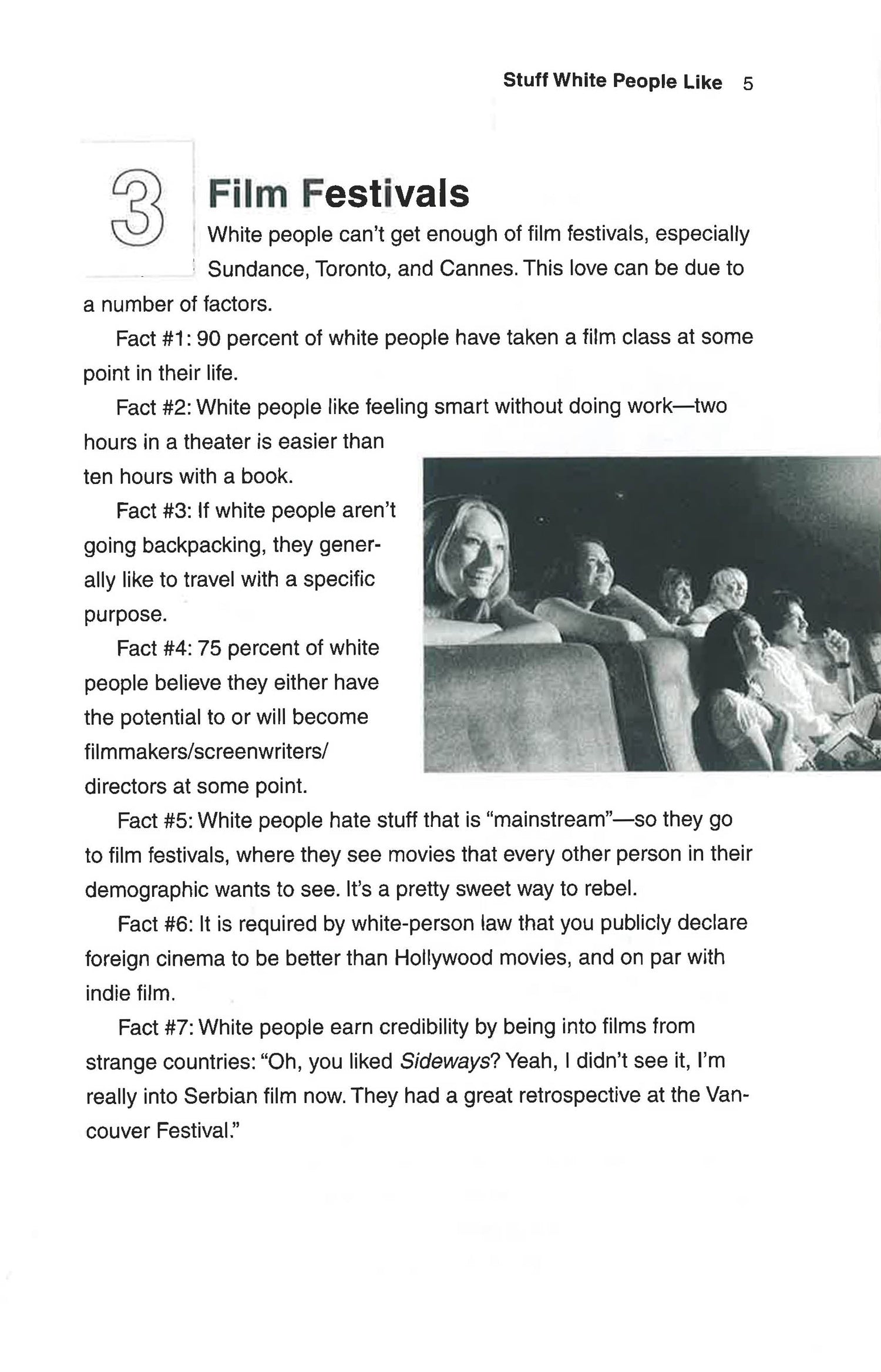 -Janet Maslin's summer picks, CBS.com "The author of "Stuff White People Like" skewers the sacred cows of lefty Caucasian culture, from the Prius to David Sedaris. . . . It gently mocks the habits and pretensions of urbane, educated, left-leaning whites, skewering their passion for Barack Obama and public transportation (as long as it's not a bus), their idle threats to move to Canada, and joy in playing children's games as adults. Kickball, anyone?"