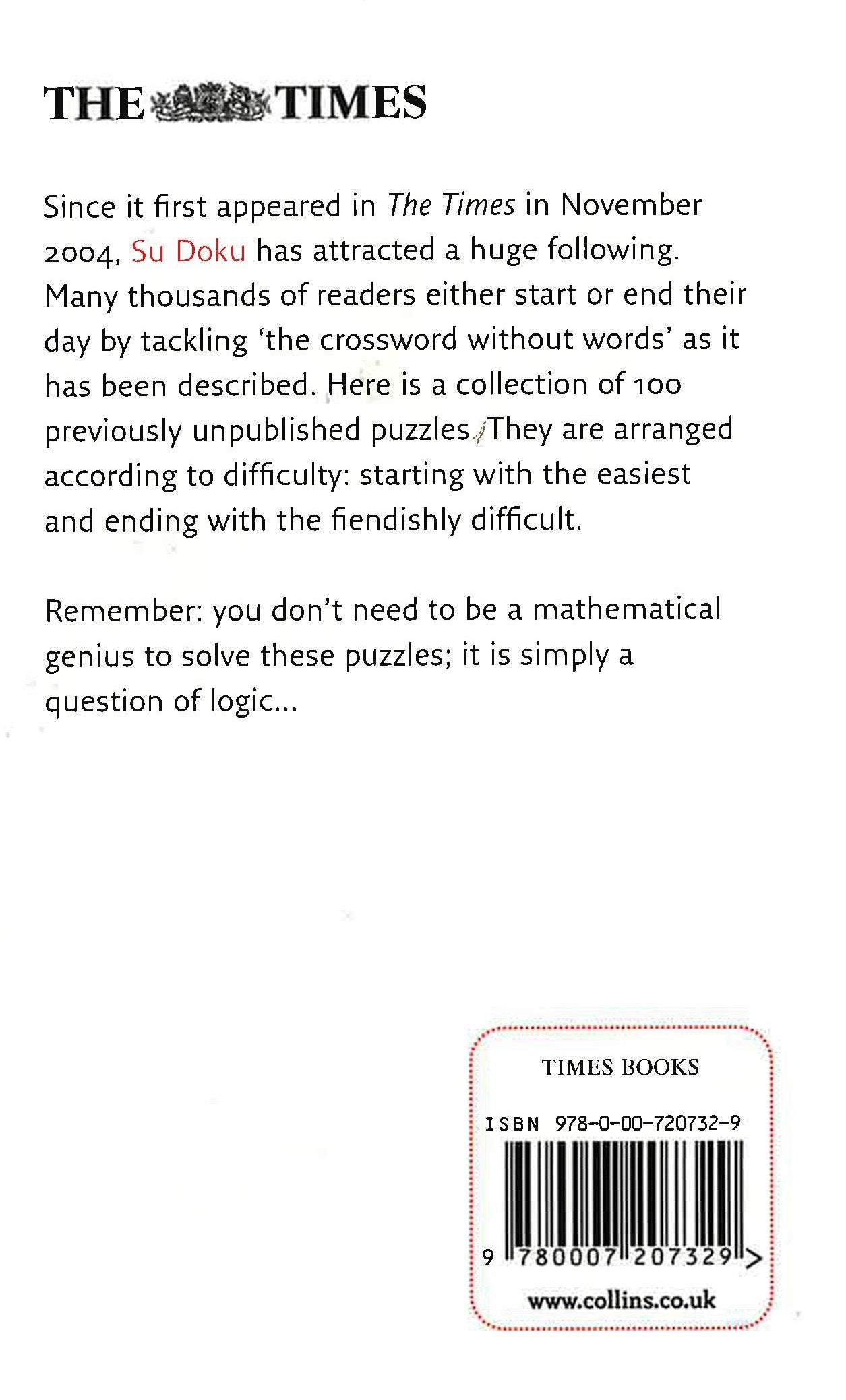 Since it first appeared in The Times in November 2004, Su Doku has attracted a huge following. Many thousands of readers either start or end their day by tackling 'the crossword without words' as it has been described. Here is a collection of 100 previously unpublished puzzles. They are arranged according to difficulty: starting with the easiest and ending with the fiendishly difficult.