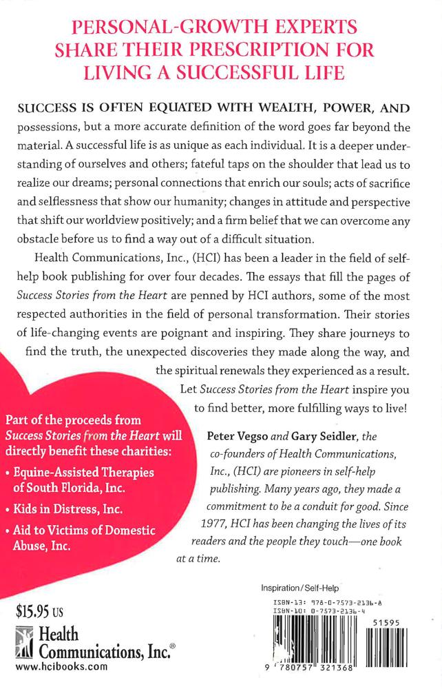 To commemorate HCI's 40th anniversary, many of its most loved and revered authors have contributed personal stories of life changing events in Success Stories from the Heart.To commemorate HCI's 40th anniversary, many of its most loved and revered authors have contributed personal stories of lifechanging events in Success Stories from the Heart. Poignant and inspiring from cover to cover, these authors generously share their personal journeys to find truth, the unexpected discoveries they made along the way, and the spiritual renewals they experienced as a result. A brave and mighty volume, Success Stories from the Heart bares their souls and tells the stories of not only their own lives, but of the many lives they've touched.Each contributing author in this extraordinary book has played a pivotal role in the advancement of mental health services and personal transformation. They coined the phrases, they made the discoveries, they are the vanguards who brought us a deeper understanding of the issues that affect us, our families, our communities, and every one of our relationships. They are the true, indispensable guides and mentors who rescue us from ourselves and each other, that teach us better, more fulfilling ways to live.These stories chronicle experiences that go beyond the educational realm, past office visits and therapy sessions, and brought them deep into the tender realm of the heart. They are the encounters that blurred the lines and made their work personal, the hopes and tears of their careers, the indelible scars that belie their commitment to do whatever it takes to make a difference. It is this blending of personal and professional life that births wisdom, that connects people, and heals a hurting world.Let Success Stories from the Heart inspire you-it's a celebration of 40 momentous years and a thrilling celebration of life!