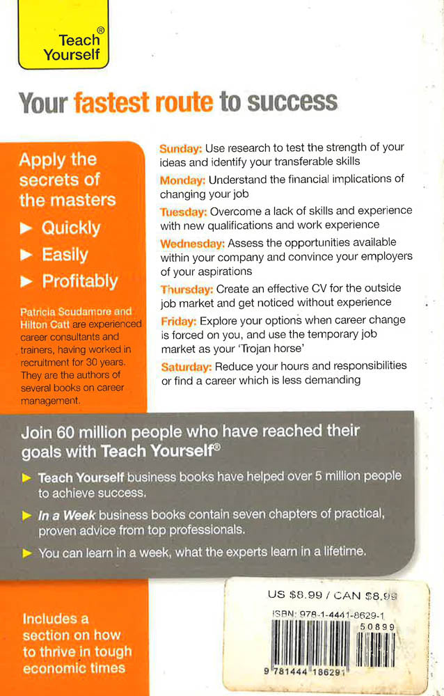 Sunday: Use research to test the strength of your ideas and identify your transferable skills Monday: Understand the financial implications of changing your job and find ways to supplement your income Tuesday: Overcome lack of skills and experience by gaining new qualifications and considering work experienceWednesday: Assess the opportunities available within your company and convince your employers of your aspirationsThursday: Create an effective CV for the outside job market and learn how to get noticed without experienceFriday: Explore your options when career change is forced on you and use the temporary job market as your 'Trojan horse'Saturday: Reduce your hours and responsibilities in your current job or find a career which is less demanding