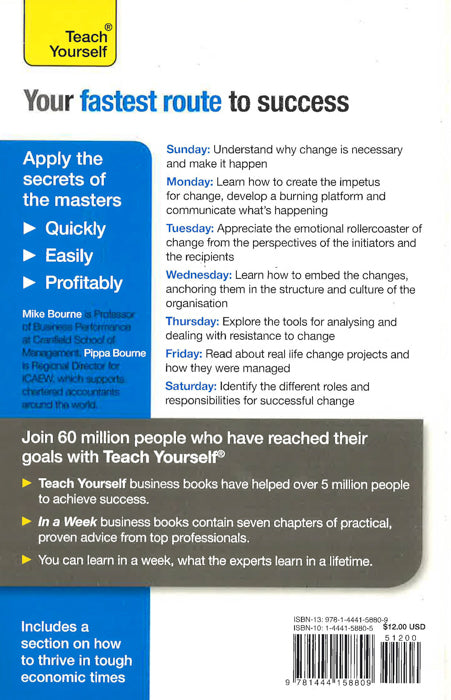 Learn in a week, what the leading experts on managing change learn in a lifetime. The ability to manage change successfully is crucial to anyone who wants to advance their career. Written by Mike and Pippa Bourne, leading experts on appraisals as both coaches and practitioners, this book quickly teaches you the insider secrets you need to know to in order to successfully manage change. The highly motivational 'in a week' structure of the book provides seven straightforward chapters explaining the key points, and at the end there are optional questions to ensure you have taken it all in. There are also cartoons and diagrams throughout, to help make this book a more enjoyable and effective learning experience. So what are you waiting for? Let this book put you on the fast track to success!