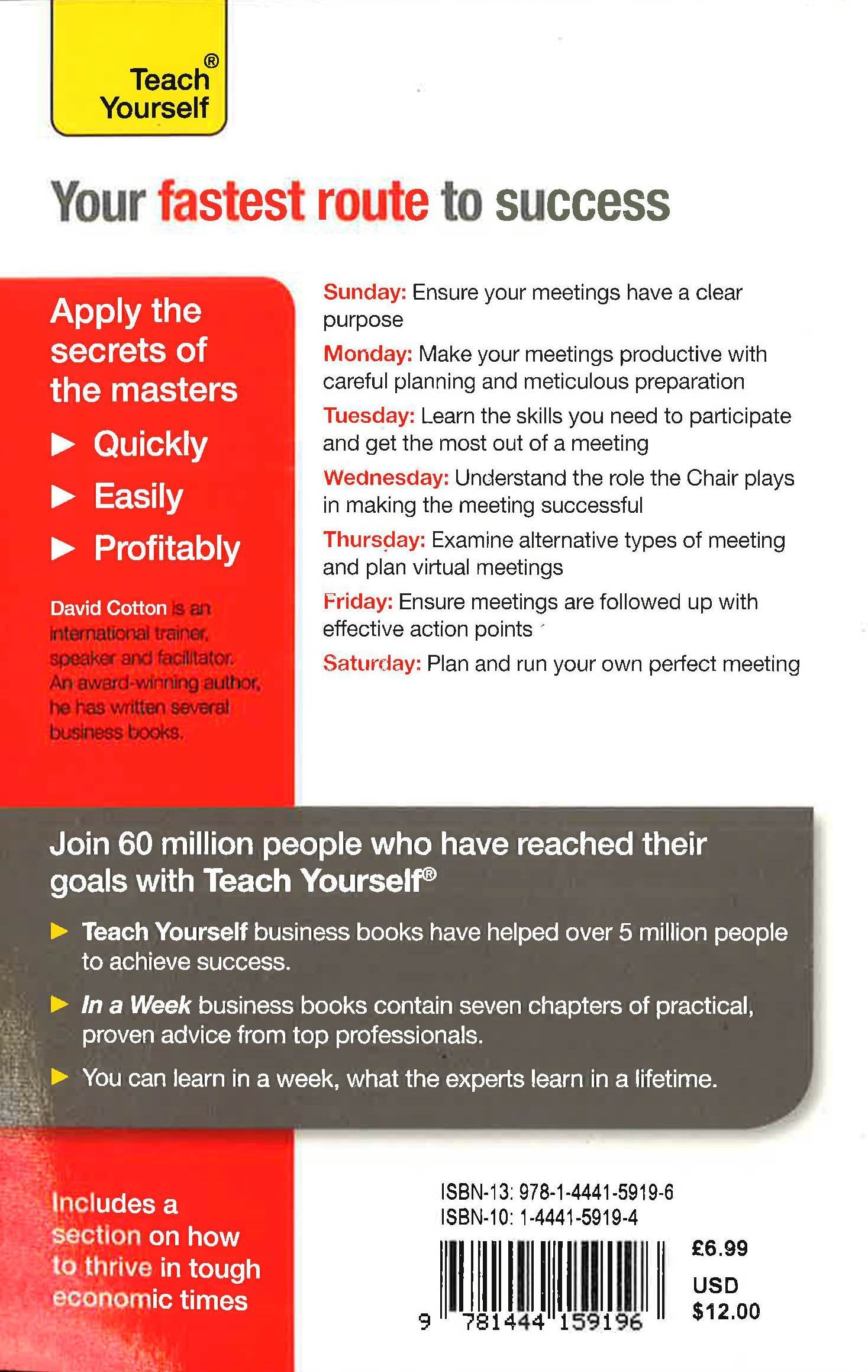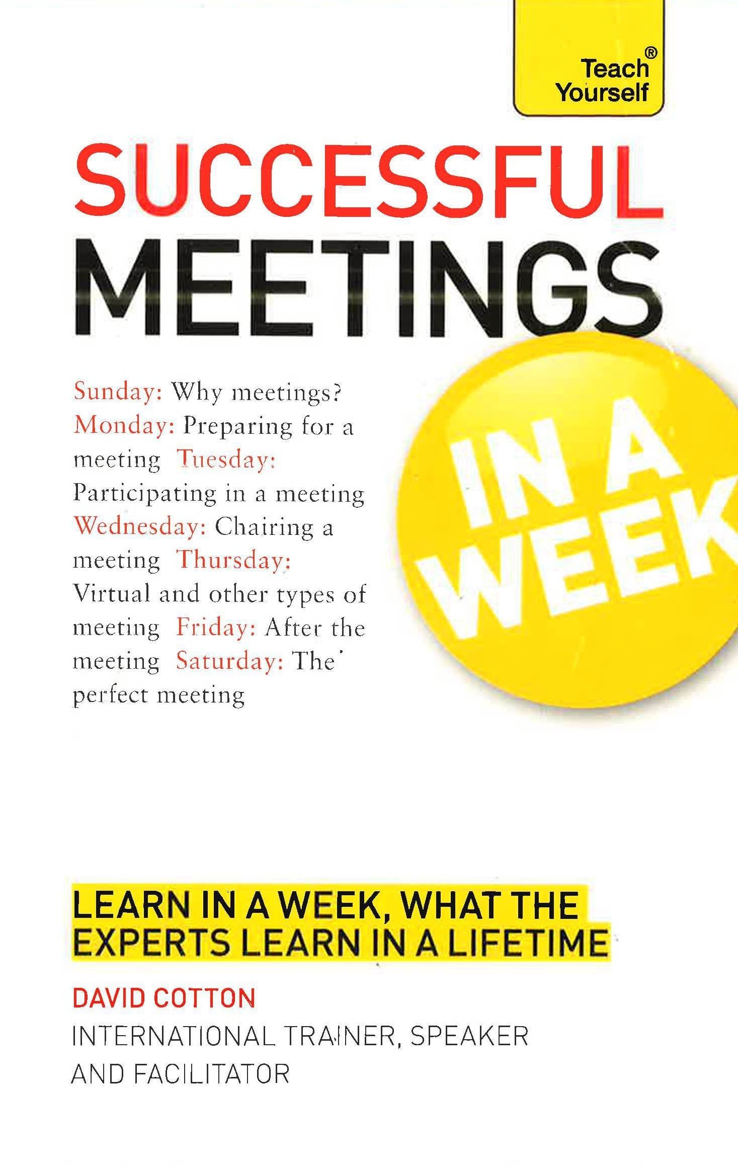 The ability to hold successful meetings is crucial to anyone who wants to advance their career. Written by David Cotton, a leading expert on meetings as both a coach and practitioner, this book quickly teaches you the insider secrets you need to know to in order to run successful meetings. The highly motivational 'in a week' structure of the book provides seven straightforward chapters explaining the key points, and at the end there are optional questions to ensure you have taken it all in. There are also cartoons and diagrams throughout, to help make this book a more enjoyable and effective learning experience. So what are you waiting for? Let this book put you on the fast track to success!