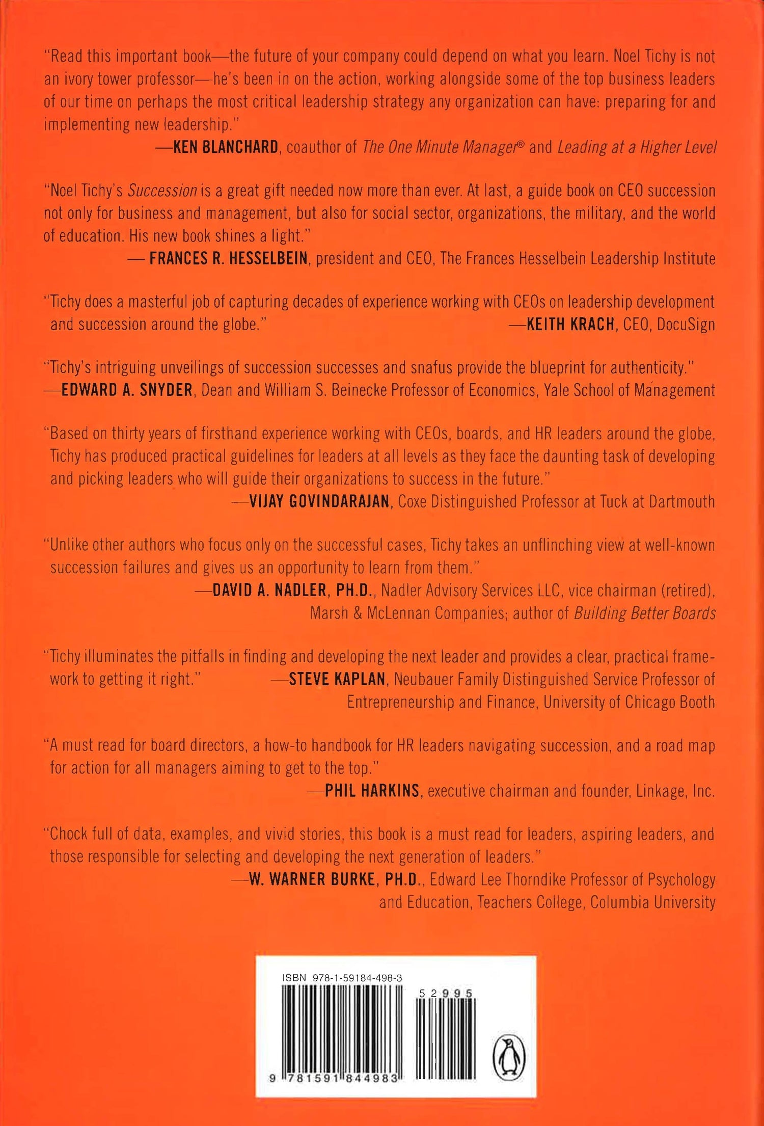 Noel Tichy has been the trusted adviser on management succession to companies including Royal Dutch Shell, Nokia, Intel, Ford, and Mercedes Benz. Succession distills his decades of experience and provides a practical framework for building effective transition pipelines - for multi-billion dollar conglomerates, family businesses or anything in between. Through revealing case studies - like Hewlett Packard, IBM, Yahoo and P&G - Tichy examines why some companies fail and others succeed in training and sustaining the next generation of senior leaders. He highlights the all too common mistakes that can generate embarrassing headlines and threaten survival. And he puts leadership development and succession where they belong: at the top of every leader's agenda. *This book may have remainder marks.
