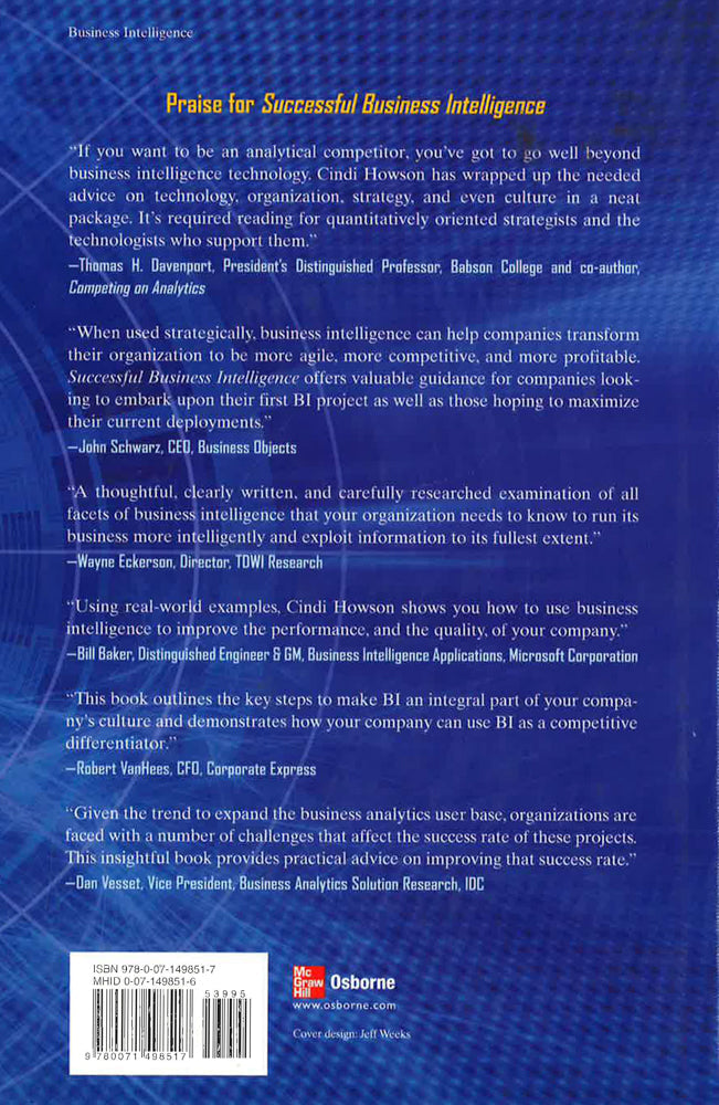 Praise for Successful Business Intelligence"If you want to be an analytical competitor, you've got to go well beyond business intelligence technology. Cindi Howson has wrapped up the needed advice on technology, organization, strategy, and even culture in a neat package. It's required reading for quantitatively oriented strategists and the technologists who support them." --Thomas H. Davenport, President's Distinguished Professor, Babson College and co-author, Competing on Analytics"When used strategically, business intelligence can help companies transform their organization to be more agile, more competitive, and more profitable. Successful Business Intelligence offers valuable guidance for companies looking to embark upon their first BI project as well as those hoping to maximize their current deployments." --John Schwarz, CEO, Business Objects"A thoughtful, clearly written, and carefully researched examination of all facets of business intelligence that your organization needs to know to run its business more intelligently and exploit information to its fullest extent." --Wayne Eckerson, Director, TDWI Research"Using real-world examples, Cindi Howson shows you how to use business intelligence to improve the performance, and the quality, of your company." --Bill Baker, Distinguished Engineer & GM, Business Intelligence Applications, Microsoft Corporation"This book outlines the key steps to make BI an integral part of your company's culture and demonstrates how your company can use BI as a competitive differentiator." --Robert VanHees, CFO, Corporate Express"Given the trend to expand the business analytics user base, organizations are faced with a number of challenges that affect the success rate of these projects. This insightful book provides practical advice on improving that success rate." --Dan Vesset, Vice President, Business Analytics Solution Research, IDC