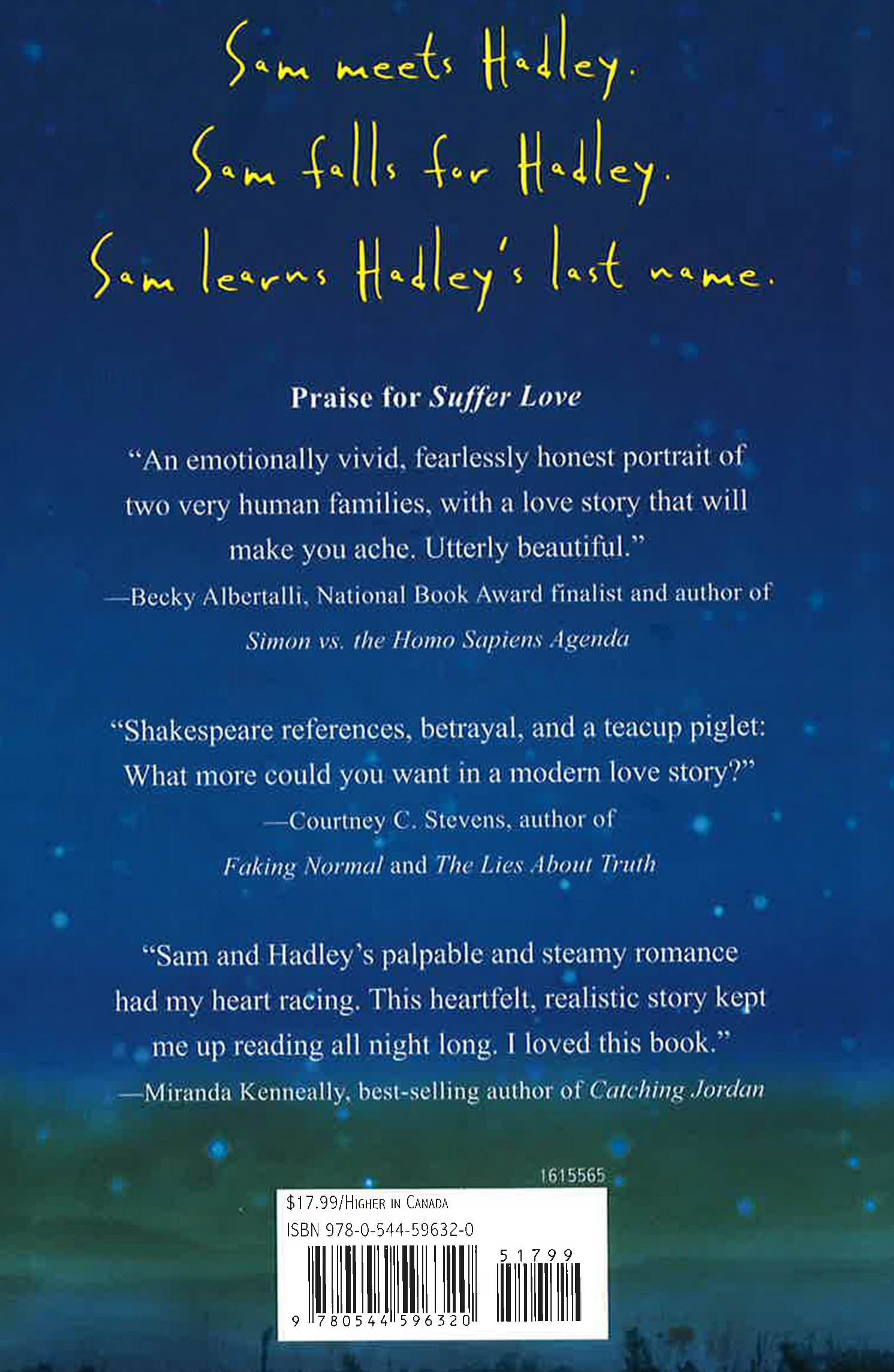 Sam Bennett falls for Hadley St. Clair before he knows her last name. When Sam finds out she is that St. Clair, daughter of the man who destroyed Sam's family, he has a choice: follow his heart or tell the truth about the scandal that links their families. Funny and passionate, Suffer Love is a story about first love, family dysfunction, and the fickle hand of fate.