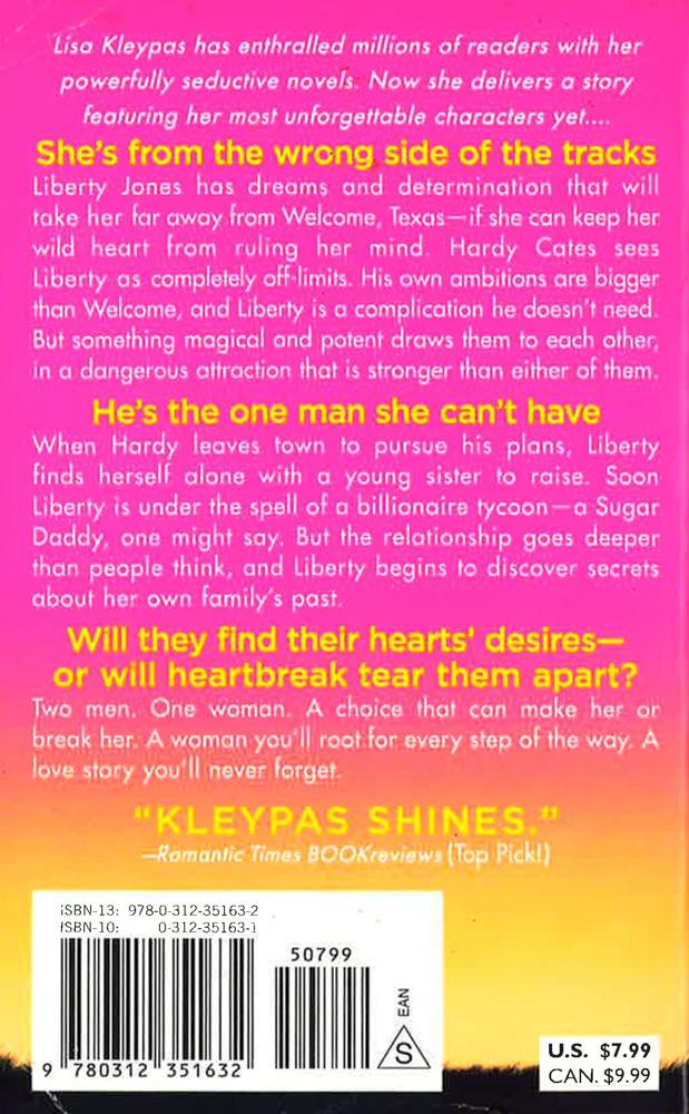 Lisa Kleypas has enthralled millions of readers with her powerfully seductive novels. Now she delivers a story featuring her most unforgettable characters yet....in Sugar Daddy SHE'S FROM THE WRONG SIDE OF THE TRACKS Liberty Jones has dreams and determination that will take her far away from Welcome, Texas---if she can keep her wild heart from ruling her mind. Hardy Cates sees Liberty as completely off-limits. His own ambitions are bigger than Welcome, and Liberty Jones is a complication he doesn't need. But something magical and potent draws them to each other, in a dangerous attraction that is stronger than both of them. HE'S THE ONE MAN SHE CAN'T HAVE When Hardy leaves town to pursue his plans, Liberty finds herself alone with a young sister to raise. Soon Liberty finds herself under the spell of a billionaire tycoon---a Sugar Daddy, one might say. But the relationship goes deeper than people think, and Liberty begins to discover secrets about her own family's past. WILL THEY FIND THEIR HEARTS' DESIRES OR WILL HEARTBREAK TEAR THEM APART? Two men. One woman. A choice that can make her or break her. A woman you'll root for every step of the way. A love story you'll never forget.
