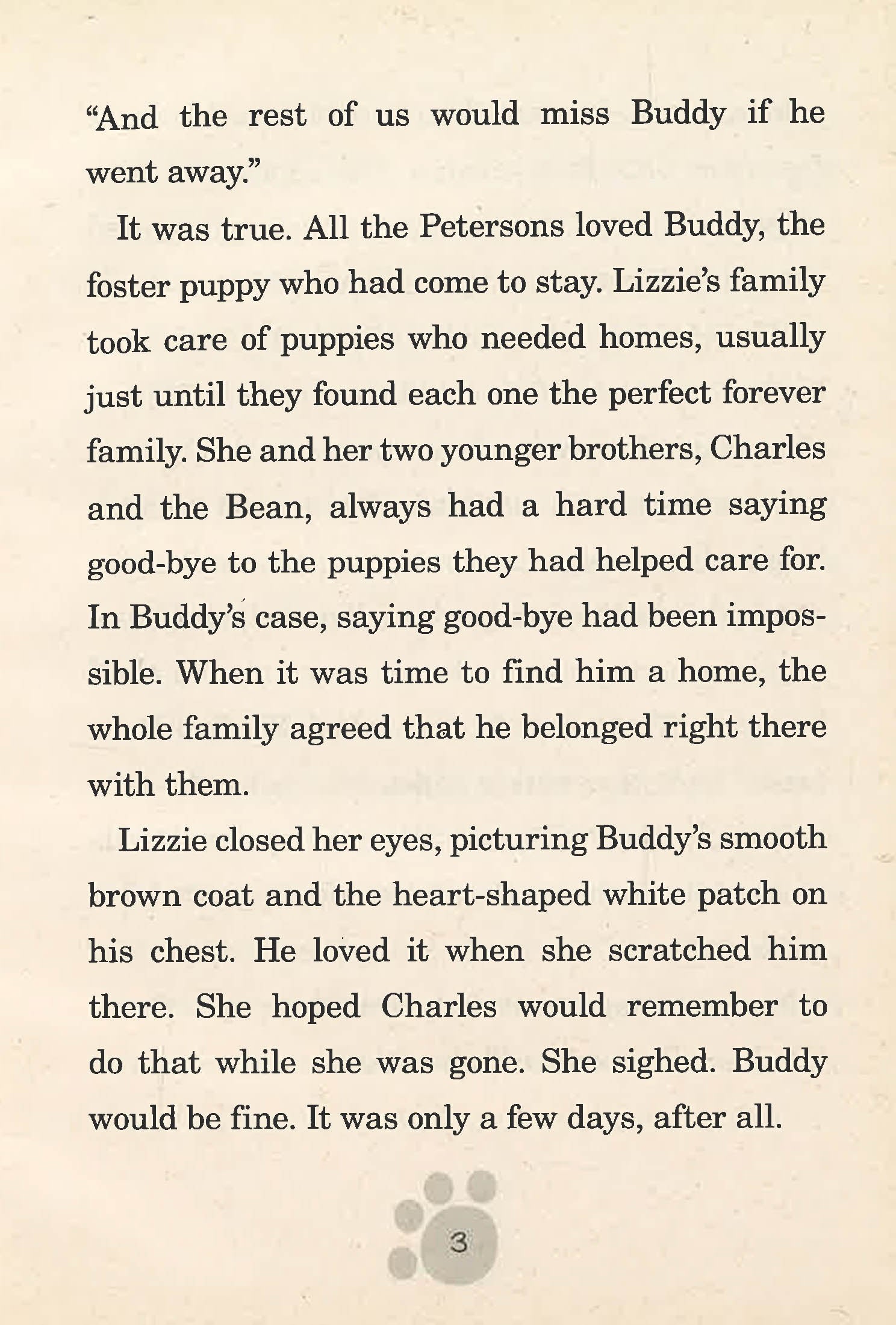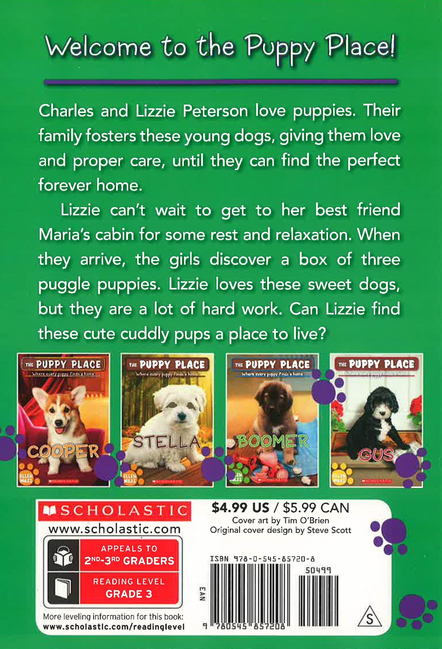 Welcome to the Puppy Place--where every puppy finds a home! Charles and Lizzie Peterson love puppies. Their family fosters these young dogs, giving them love and proper care, until they can find the perfect forever home. Lizzie can't wait to get to her best friend Maria's cabin for some rest and relaxation. When they arrive, the girls discover a box of three puggle puppies waiting for them. Lizzie loves taking care of the sweet dogs but it is a lot of hard work. Will Lizzie be able to find these cute cuddly pups a place to live?