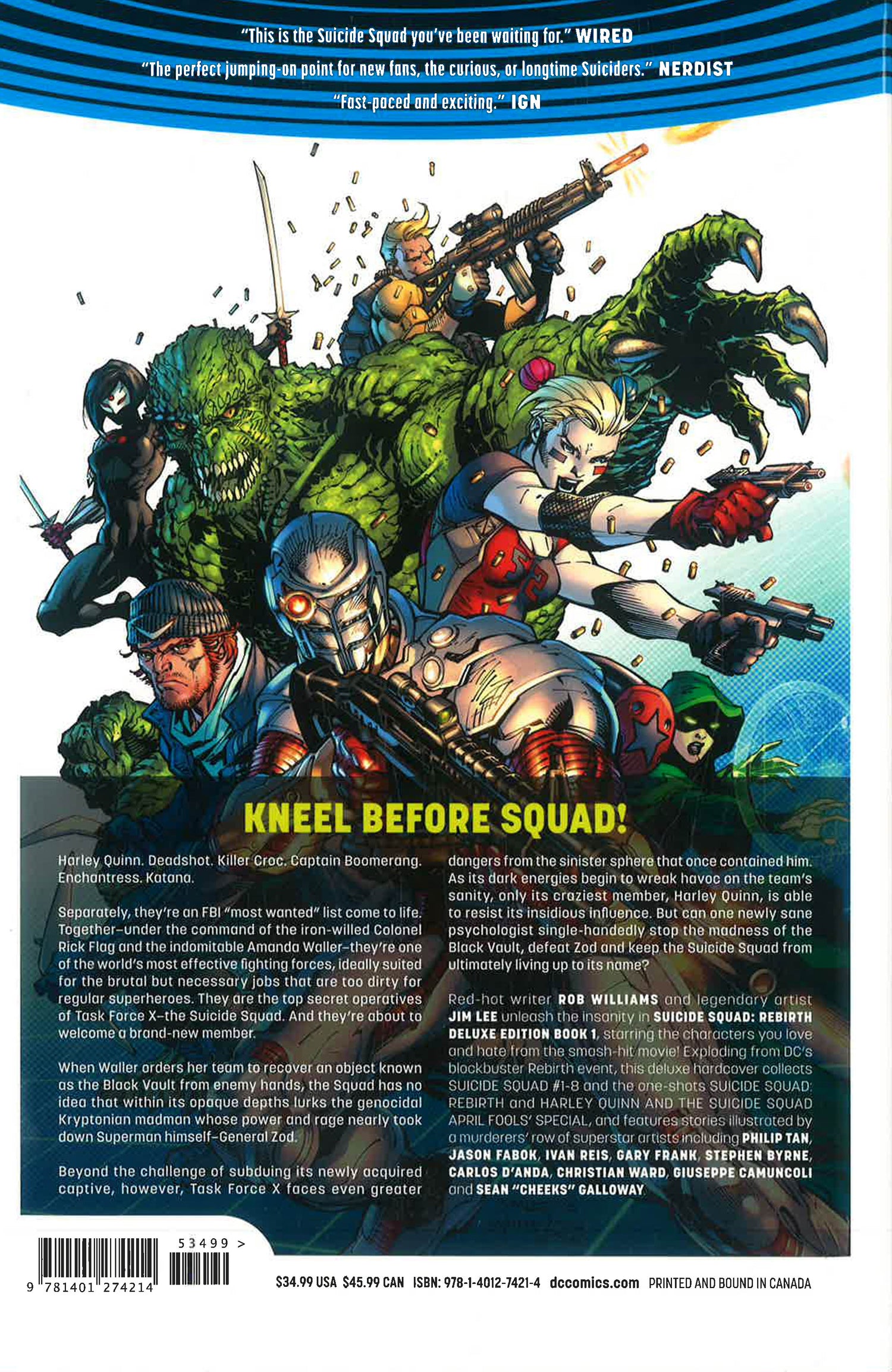 Red-hot writer Rob Williams and legendary artist Jim Lee unleash the insanity in SUICIDE SQUAD: REBIRTH DELUXE EDITION BOOK #1, starring the characters you love and hate from the smash-hit movie! Exploding from DC’s blockbuster Rebirth event, this deluxe hardcover collects SUICIDE SQUAD #1-8 and the one-shots SUICIDE SQUAD: REBIRTH and HARLEY QUINN AND THE SUICIDE SQUAD APRIL FOOLS’ SPECIAL, and features stories illustrated by a murderers’ row of superstar artists including Philip Tan, Jason Fabok, Ivan Reis, Gary Frank, Stephen Byrne, Carlos D’Anda, Christian Ward, Giuseppe Camuncoli and Sean “Cheeks” Galloway.