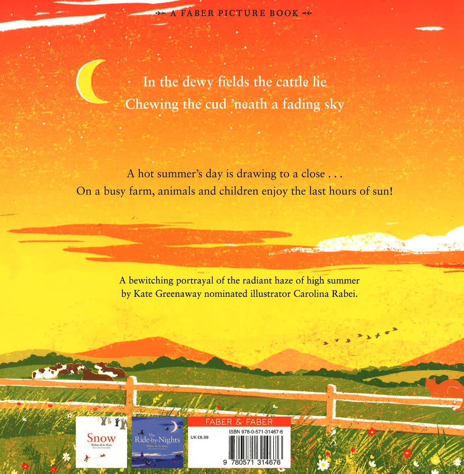 The sandy cat by the Farmer's chair Mews at his knee for dainty fare; Old Rover in his moss-greened house Mumbles a bone, and barks at a mouse. Carolina Rabei's stunning illustrations beautifully illuminate Walter de la Mare's glorious celebration of a balmy summer's evening. One of four exceptional Walter de la Mare picture books that form a seasonal set, each with complementing colour palates and illustrations by rising young star Carolina Rabei.