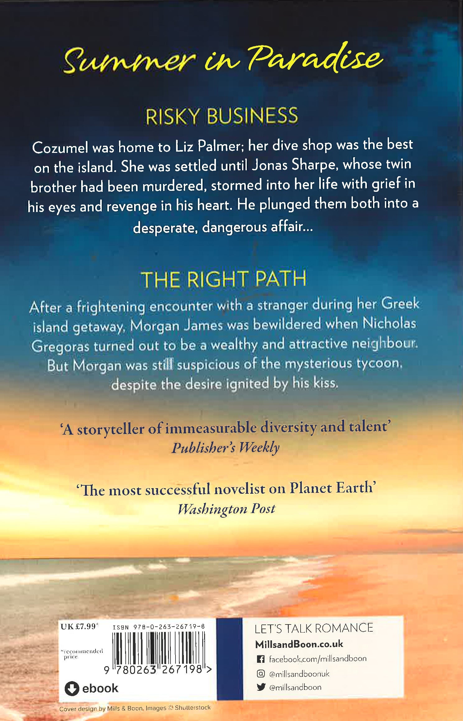THE INTERNATIONAL BESTSELLING AUTHOR 'The most successful novelist on Planet Earth' - Washington Post THE INTERNATIONAL BESTSELLING AUTHOR 'The most successful novelist on Planet Earth' - Washington Post Blue cloudless skies, azure sparkling seas, golden beaches...join New York Times bestselling author Nora Roberts for the perfect summer escape Risky Business Cozumel was home to Liz Palmer now; her dive shop was the best on the island. She was settled until Jonas Sharpe, twin brother to her murdered diving instructor, stormed into her life with grief in his eyes and revenge in his heart. He plunged them both into a desperate, dangerous affair... The Right Path After a frightening encounter with a stranger during her Greek island getaway, Morgan James was bewildered when Nicholas Gregoras turned out to be a wealthy and attractive neighbour. But Morgan was still suspicious of the mysterious tycoon, despite the desire ignited by his kiss.Spend your holiday with Nora Roberts! `A storyteller of immeasurable diversity and talent' - Publisher's Weekly