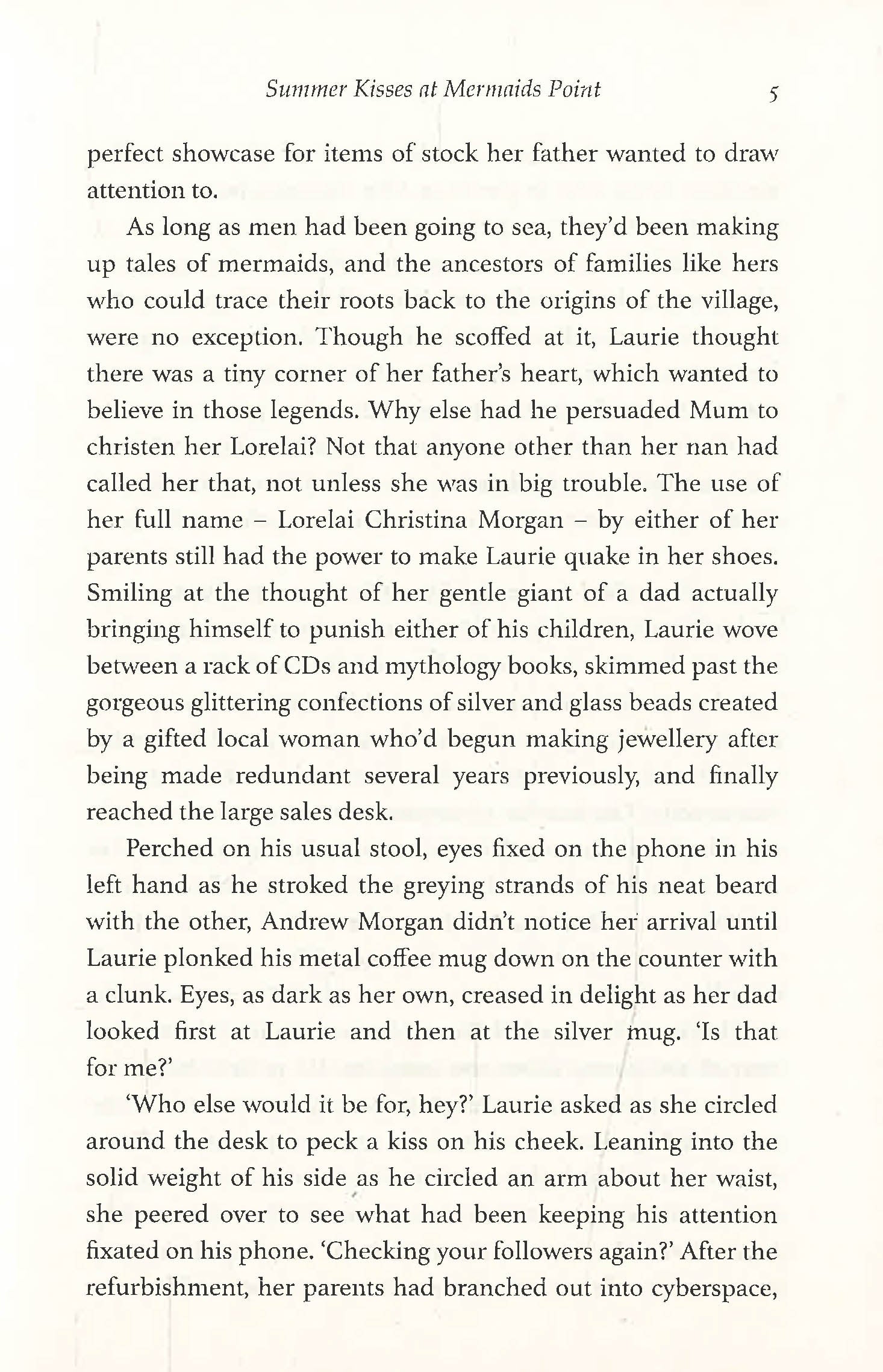 The most eye-catching of the new arrivals is handsome author, Jake Smith, who has rented a cottage for the summer while he works on his new book. Or so he says. In fact, he is a journalist, burned out and disillusioned with life, whose editor has sent him on a crack-pot hunt for mermaids...