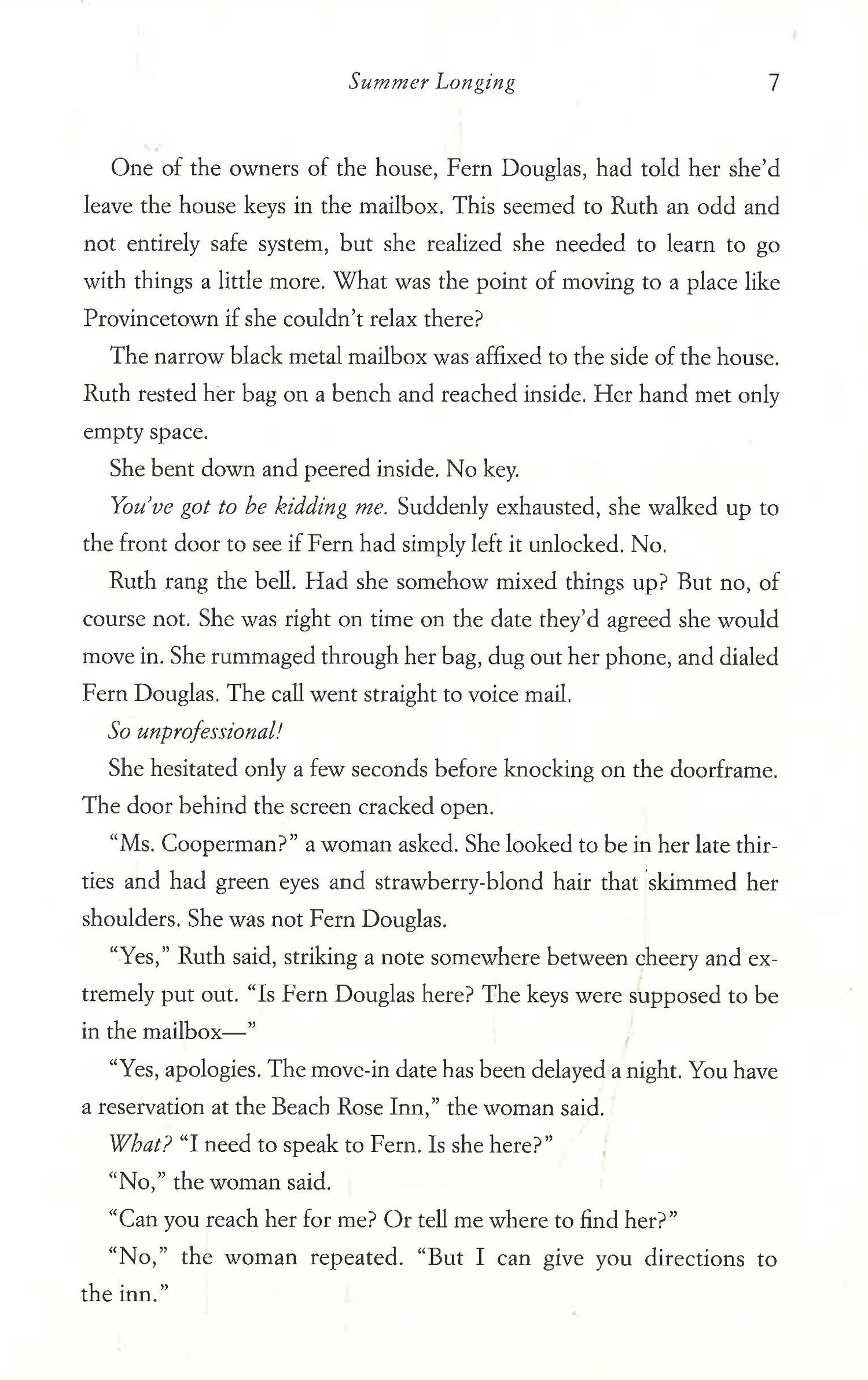 Ruth Cooperman arrives in beautiful beachside Provincetown for her retirement, renting the perfect waterfront cottage while she searches for her forever home. After years of hard work and making peace with life's compromises, Ruth is looking forward to a carefree summer of solitude. But when she finds a baby girl abandoned on her doorstep, Ruth turns to her new neighbors for help and is drawn into the drama of the close-knit community.