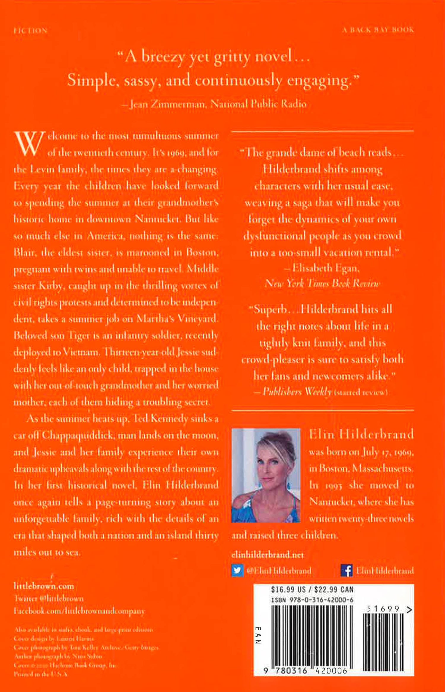 Welcome to the most tumultuous summer of the twentieth century. It's 1969, and for the Levin family, the times they are a-changing. Every year the children have looked forward to spending the summer at their grandmother's historic home in downtown Nantucket. But like so much else in America, nothing is the same: Blair, the oldest sister, is marooned in Boston, pregnant with twins and unable to travel. Middle sister Kirby, caught up in the thrilling vortex of civil rights protests and determined to be independent, takes a summer job on Martha's Vineyard. Only-son Tiger is an infantry soldier, recently deployed to Vietnam. Thirteen-year-old Jessie suddenly feels like an only child, marooned in the house with her out-of-touch grandmother and her worried mother, each of them hiding a troubling secret. As the summer heats up, Ted Kennedy sinks a car in Chappaquiddick, man flies to the moon, and Jessie and her family experience their own dramatic upheavals along with the rest of the country. In her first historical novel, rich with the details of an era that shaped both a nation and an island thirty miles out to sea, Elin Hilderbrand once again earns her title as queen of the summer novel.