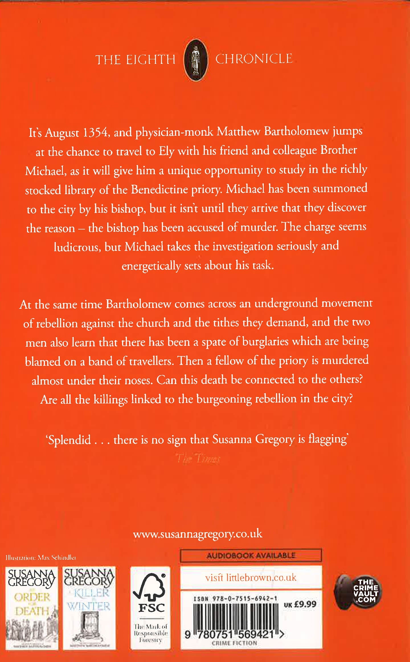It's August, 1354, and physician-monk Matthew Bartholomew jumps at the chance to travel to Ely with his friend and colleague Brother Michael, as it will give him a unique opportunity to study in the richly stocked library of the Benedictine priory. Michael has been summoned to the city by his bishop, but it isn't until they arrive that they discover the reason - the bishop has been accused of murder. The charge seems ludicrous, but Michael takes the investigation seriously and energetically sets about his task.