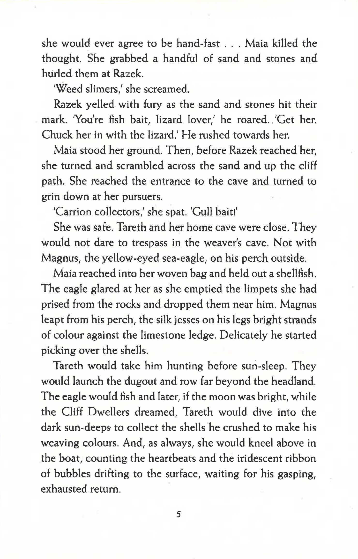 On her 13th birthday Maia, who has been brought up by Tareth, the weaver and warrior who she has always believed is her father, falls into an adventure that will take her on a perilous journey to a kingdom poisoned by bitterness and jealousies. A kingdom that she must save. Tareth is no ordinary weaver - the silk he weaves sings of destiny and danger, of Maia's future. Because she is no ordinary girl either. She has always been the flame-headed outsider among the Cliff Dwellers, but she doesn't want to listen to the song of the silk, or to the terrifying words of the village Watcher. Guarding her secret, denying her future, Maia steps into places she has never explored where she'll encounter mercenaries, spies, friends and enemies. And where she will face her destiny as a Sun Catcher.