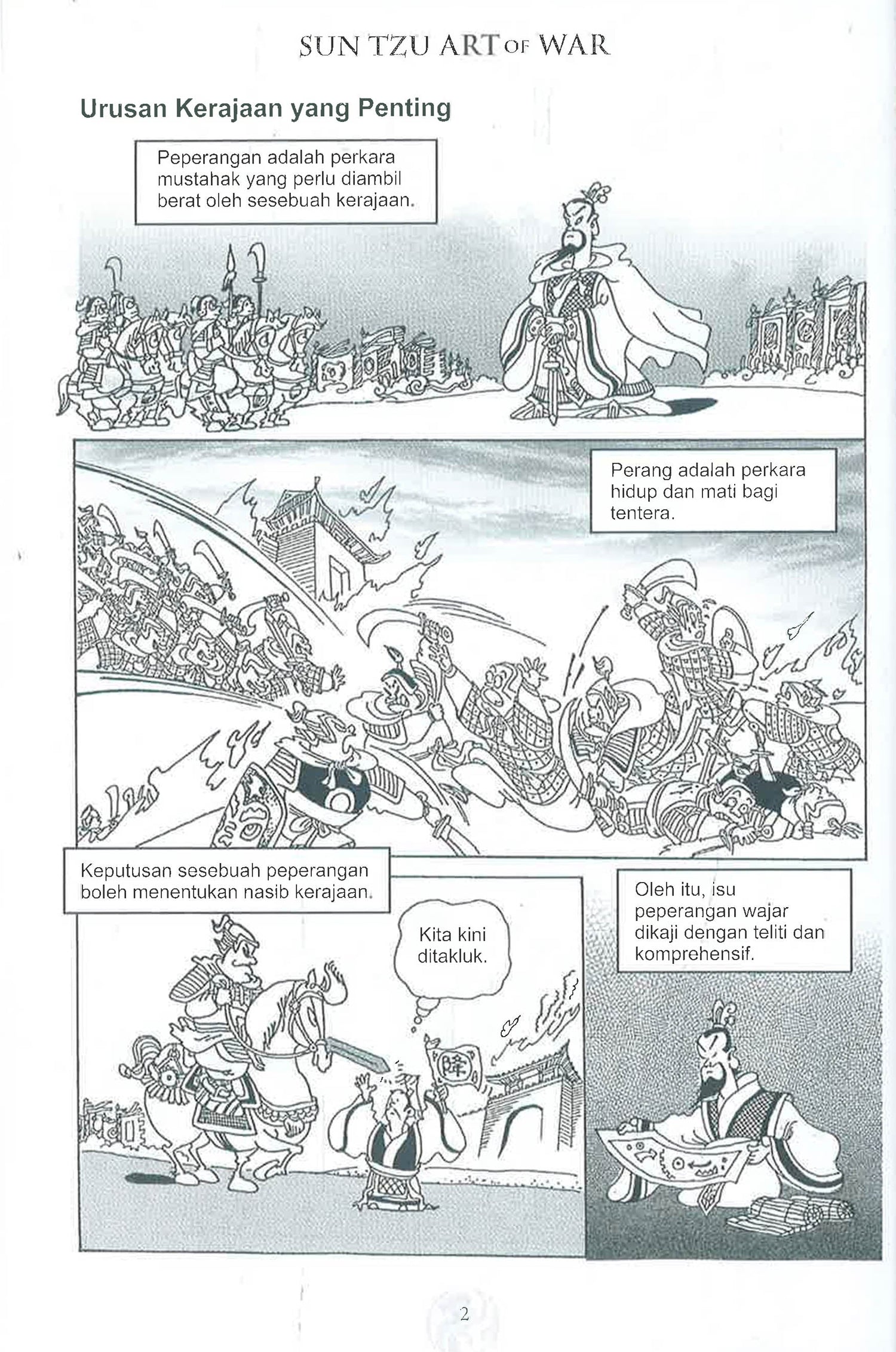 Buku ini mengandungi lukisan komik sebanyak tiga belas bab Art of War karya Sun Tzu serta menggambarkan pemikiran Sun Tzu secara komprehensif. Turut dimasukkan contoh-contoh yang relevan dari sejarah China untuk memberi gambaran yang lebih jelas tentang idea asal Sun Tzu. Buku ini juga menekankan bahawa walaupun pertempuran-pertempuran terkenal sudah disebut dalam buku-buku yang lain, mereka tetap dipaparkan di sini sebagai perbincangan dan analisis tambahan. Ini adalah supaya para pembaca dapat mengambil kira pelbagai elemen peperangan termasuk faktor tentera, politik dan kewangan. Buku ini turut menyentuh isu-isu seperti perlantikan jeneral, pengaturan anggota tentera dan fomrasi bagi membolehkan buku ini difahami dari pelbagai sudut pandangan agar buku ini terus bermanfaat biarpun dibaca berulang kali.