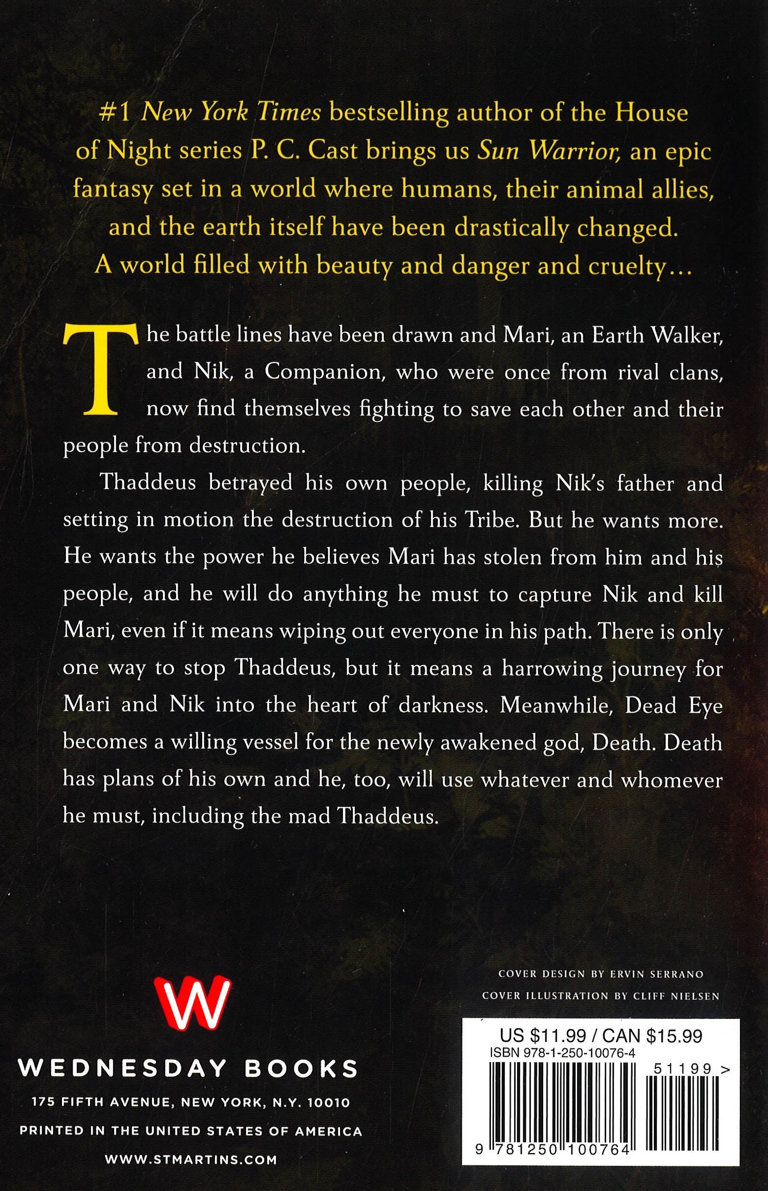 #1 New York Times bestselling author of the House of Night series, P.C. Cast, brings us Sun Warrior, an epic fantasy set in a world where humans, their animal allies, and the earth itself has been drastically changed. A world filled with beauty and danger and cruelty . . . The battle lines have been drawn and Mari, an Earth Walker and Nik, a Companion, who were once from rival clans now find themselves fighting to save each other and their people from destruction. Thaddeus betrayed his own people, killing Nik’s father and destroying their entire clan. But he wants more. He wants the power he believes Mari has stolen from him and his people and he will do anything he must to get them back, even if it means destroying everything in his path. There is only way to stop Thaddeus, but it means a harrowing journey for Mari and Nik into the heart of darkness. Meanwhile, Dead Eye becomes a willing vessel for the newly awakened god, Death. Death has plans of his own and he, too, will use whatever and whomever he must, including the mad Thaddeus.