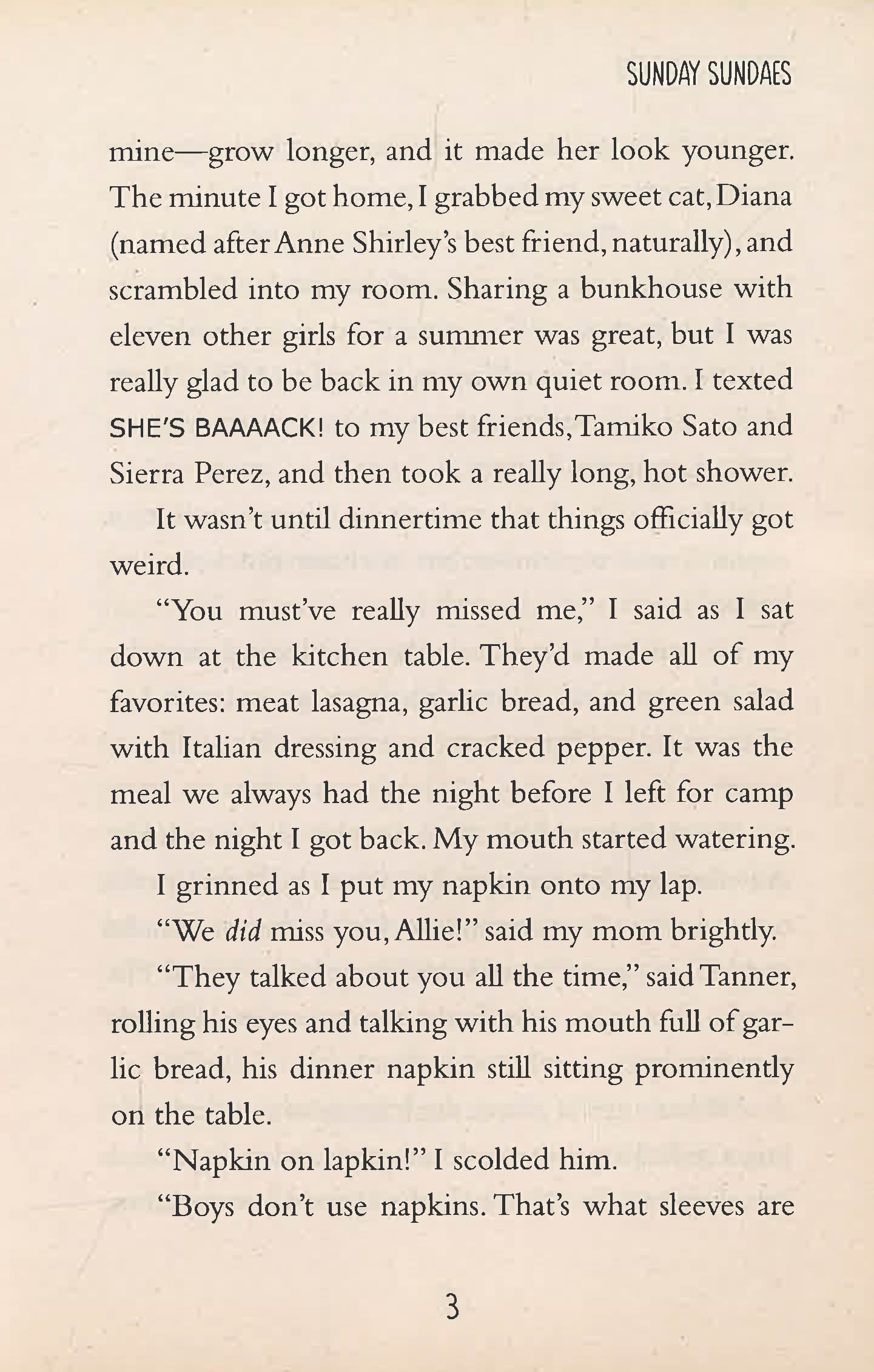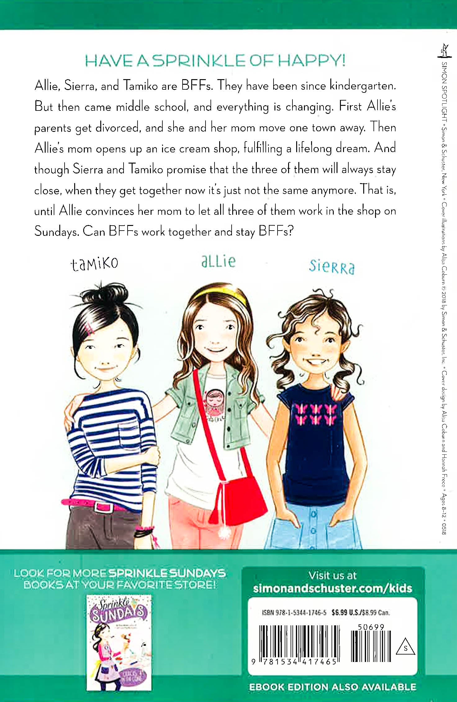 Meet the Sunday Sundae Sisters! Allie, Sierra, and Tamiko have been best friends since kindergarten. Now Allie’s parents are divorced and Allie has moved one town away. She can still see her friends but she no longer goes to the same middle school. So that means new teachers, new classrooms, and new students to deal with - all without her BFFs for support. But when Allie’s mom decides to fulfill her lifelong dream and open up an ice cream shop, Allie has an idea. Maybe she and her friends can work in the shop every Sunday! It’s a way for them to stay in touch every week and have fun - that is, of course, until they actually start working.The girls soon discover that working in an ice cream shop is more than just scooping cones and adding toppings. It’s serious work and Allie feels the pressure of having to “be the boss” around her friends. Can the girls work together every week and still remain BFFs? They can - especially when they settle their differences over an ice cream cone.