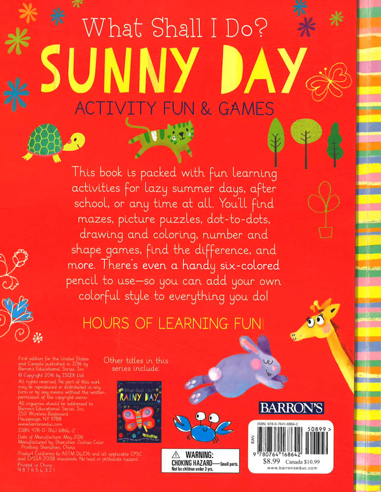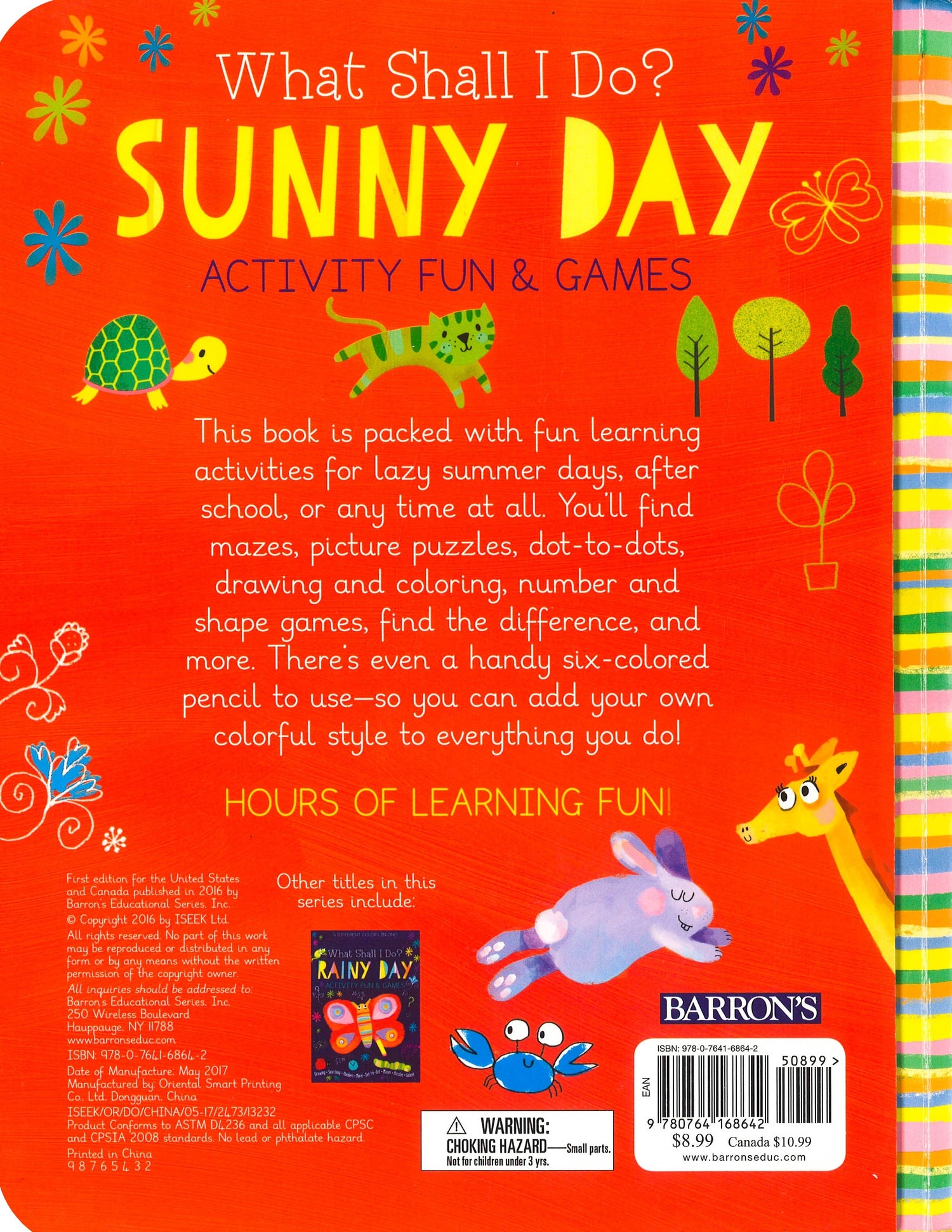 Tired of hearing, "I'm BORED?" Give children these entertaining activity books packed with hours of learning activities that are intriguing and fun. In Sunny Day Activity Fun & Games, kids will spend hours absorbed by fun searches, puzzles, drawing and coloring activities, and more. It even comes with a multicolored, stackable pencil that lets them use 6 different vibrant colors! Books in the What Shall I Do? series are great options when you want to steer children away from television or the computer (the less screen time, the better) but you want to encourage hand-eye coordination, challenge their minds, and keep them amused at home or on the go.