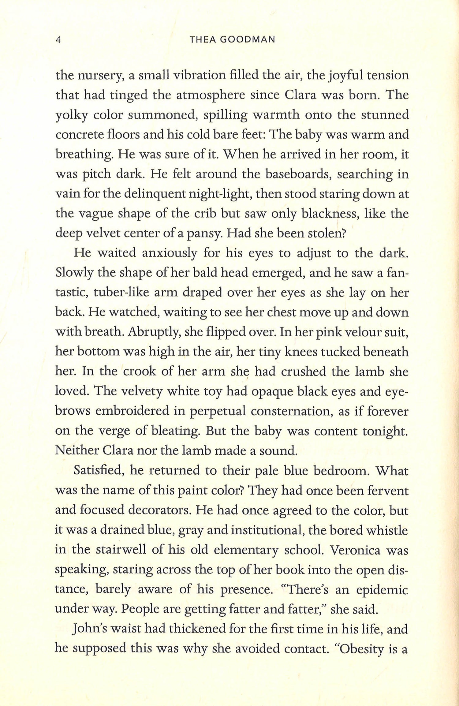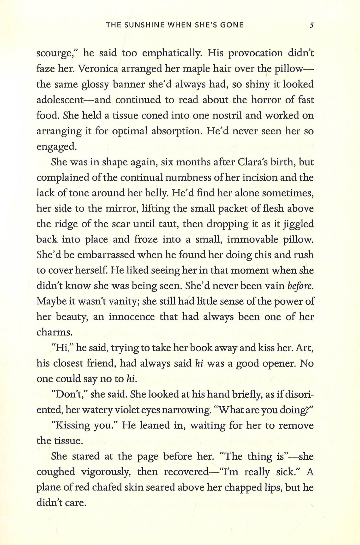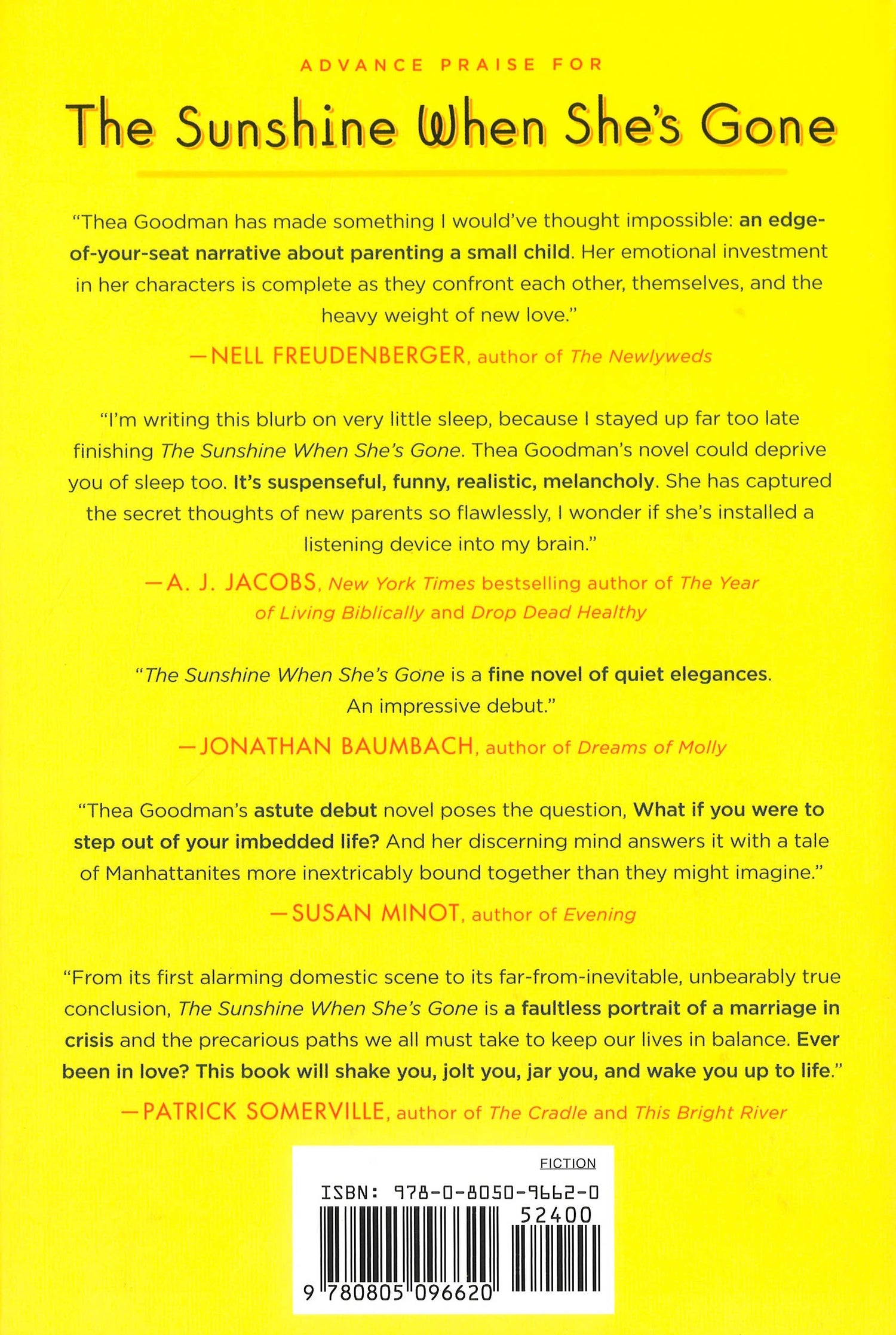 A fresh, funny, and wisely observed debut novel about marriage--about the love, longing and ambivalence exposed when a husband takes the baby on a highly unusual outingWhen Veronica Reed wakes up one frigid January morning, two things are "off"--first of all, she has had a good night's sleep, which hasn't happened in months, and second, both her husband and her baby are gone. Grateful for the much-needed rest, Veronica doesn't, at first, seriously question her husband's trip out to breakfast with baby Clara. Little does she know, her spouse has fled lower Manhattan, with Clara, for some R&R in the Caribbean. Told through alternating points of view, "The Sunshine When She's Gone" explores the life-changing impact of parenthood on a couple as individuals and as partners. Thea Goodman brings us into intimacies made tense by sleep-deprivation and to losses and gains made more real by acknowledging them. Here is the story of a couple pushed to the edge and a desperate father's attempt give them both space to breathe.
