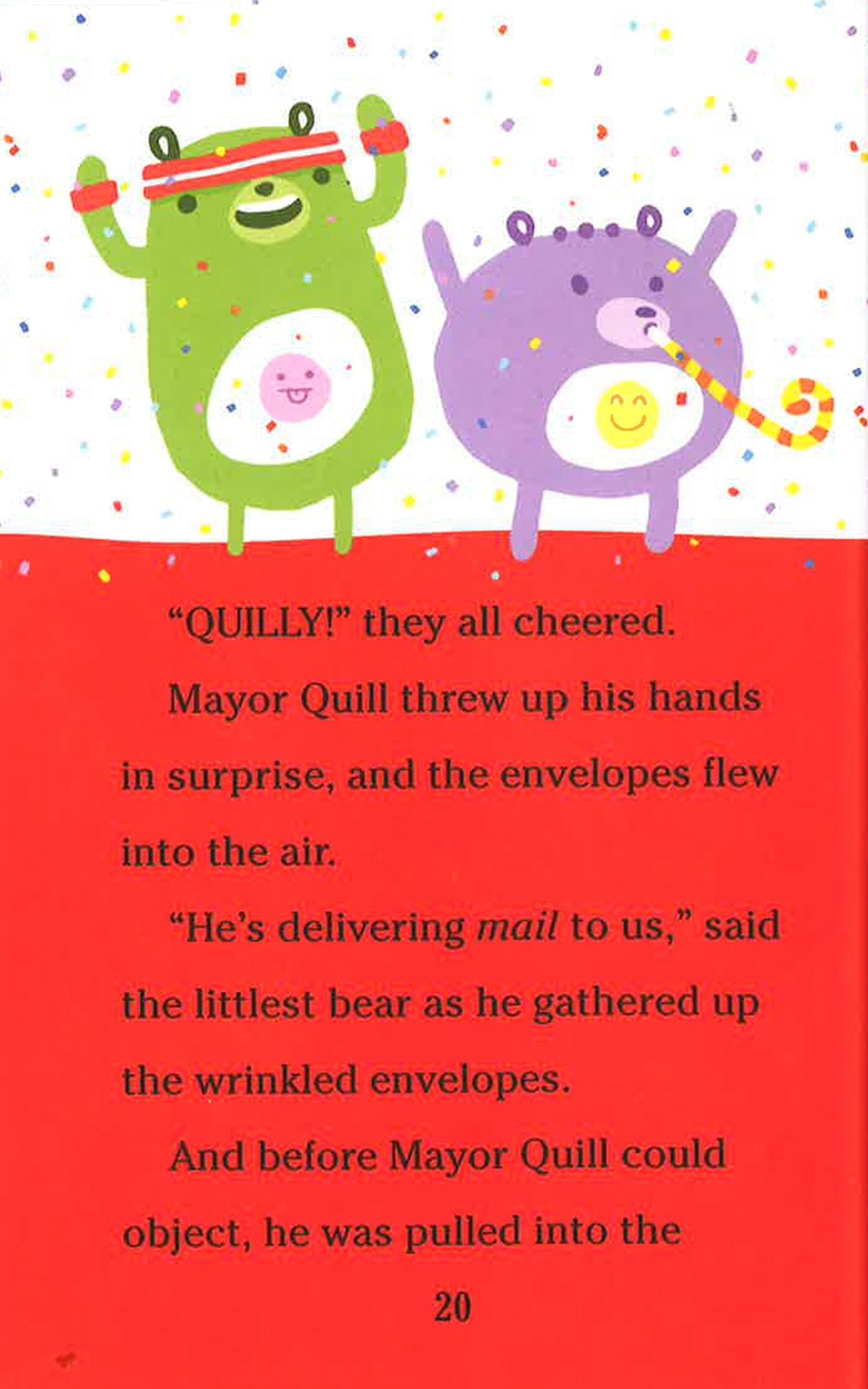 In Gnawing Around, the animals of the Grumpy Woods are even grumpier than usual when a new family of beavers moves in. Their dam is drying up the river! Mayor Quill decrees they are not welcome, but the bears disagree. Can their dance party save the day?