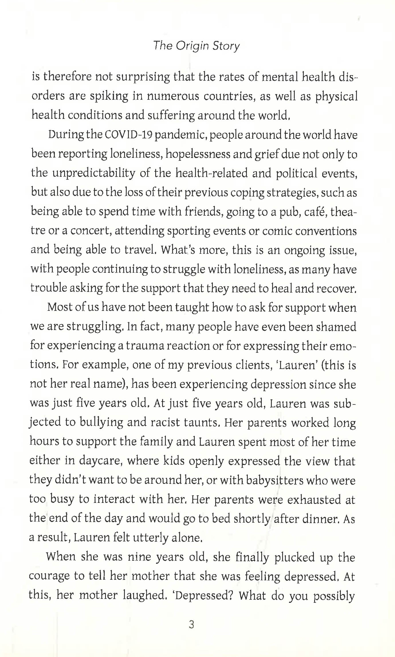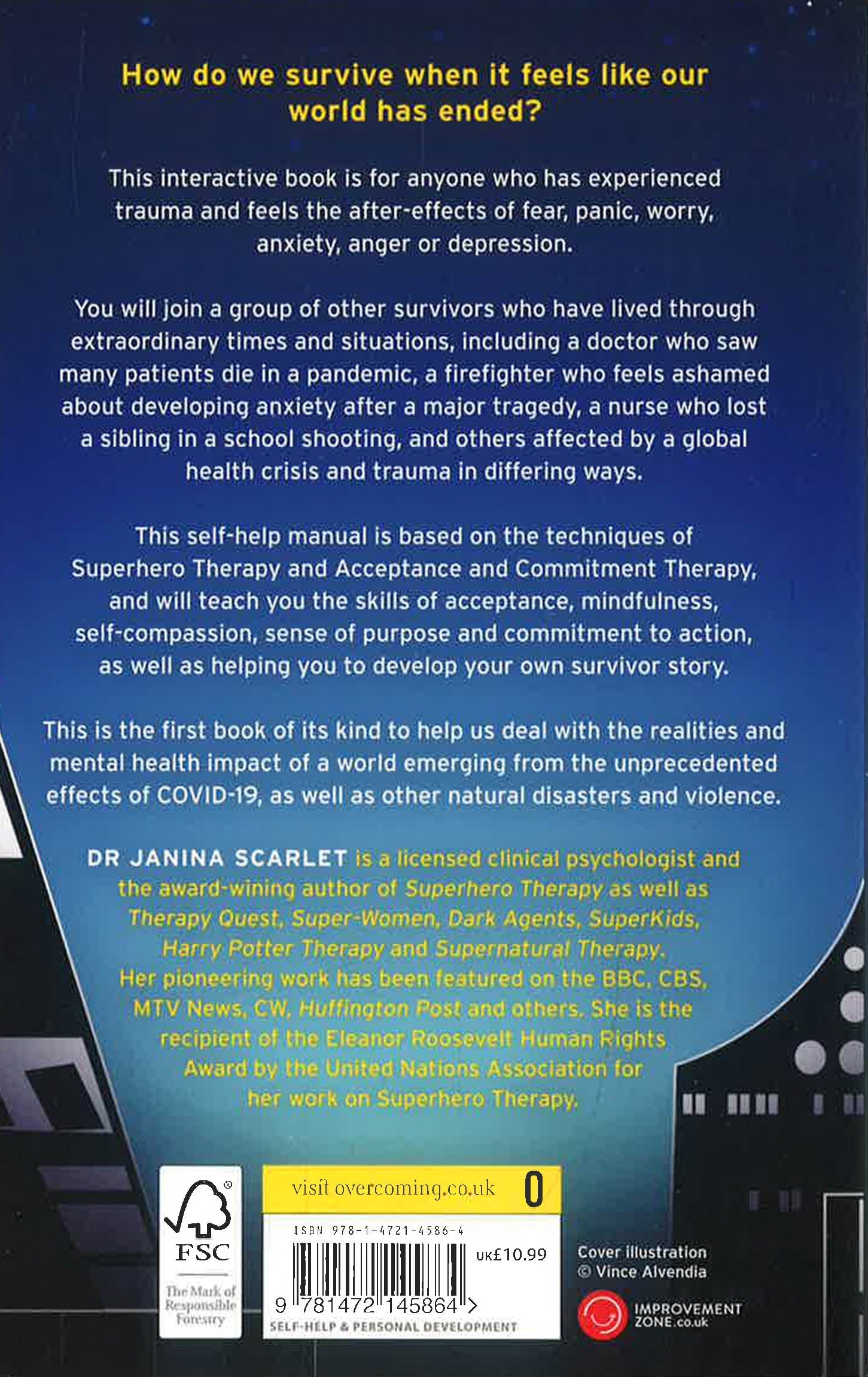 How do we survive when it feels like our world has ended?This interactive book is for anyone that has experienced trauma and feels the after-effects of fear, panic, worry, anxiety, anger or depression.You will join a group of other survivors who have lived through extraordinary times and situations, including a doctor who saw many patients die in a pandemic, a firefighter who feels ashamed about developing anxiety after a major tragedy, a nurse who lost a sibling in a school shooting, and others affected by a global health crisis and trauma in differing ways.This self-help manual is based on the techniques of Superhero Therapy and Acceptance and Commitment Therapy and will teach you the skills of acceptance, mindfulness, self-compassion, sense of purpose and commitment to action, as well as helping you to develop your own survivor story.This is the first book of its kind to help us deal with the realities and mental health impact of a world emerging from the unprecedented effects of COVID-19, as well as other natural disasters and violence.