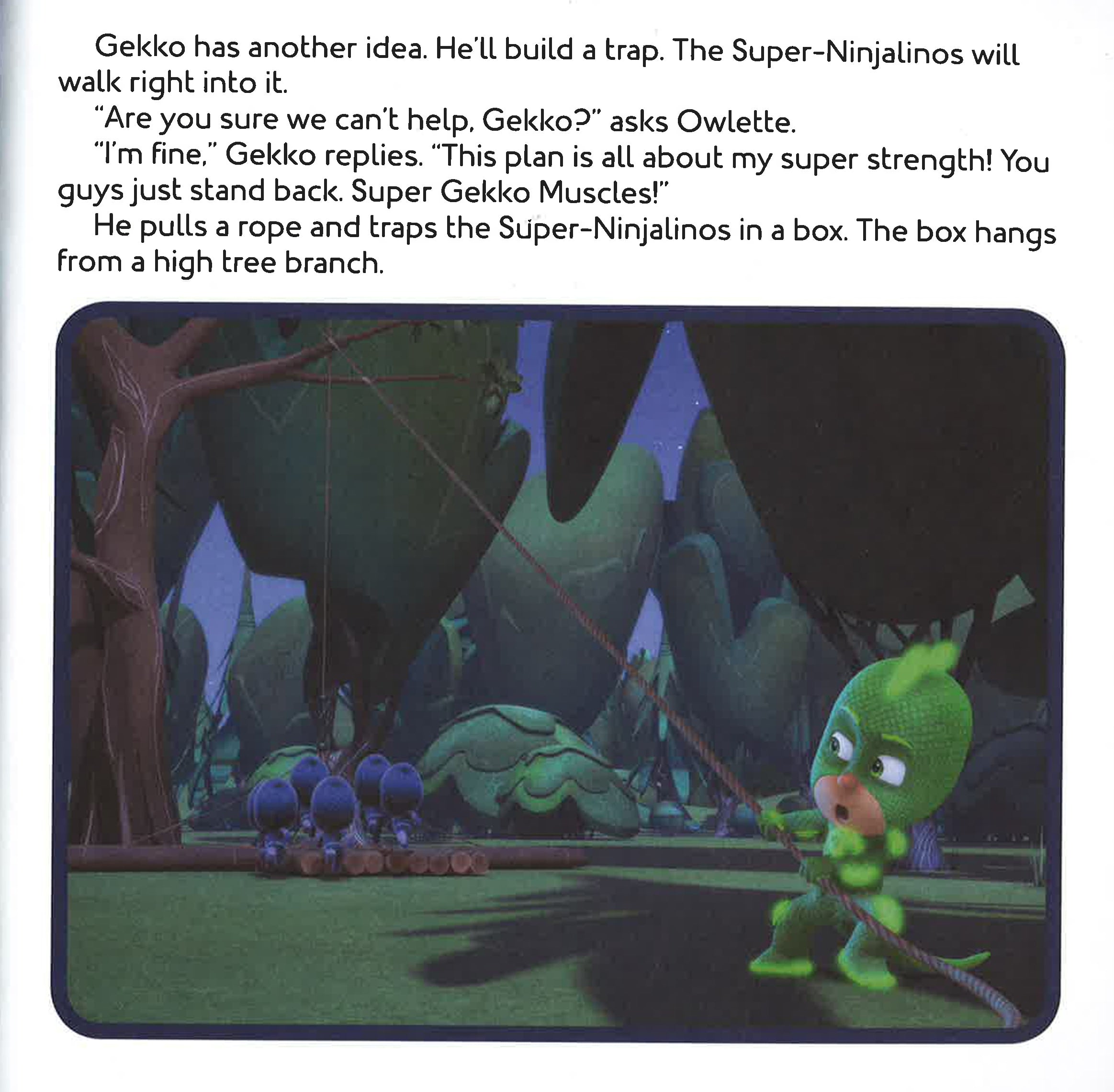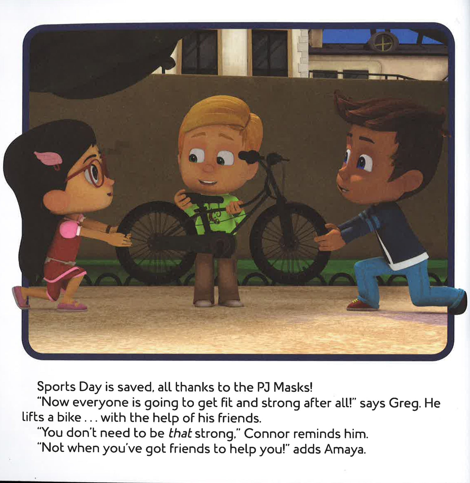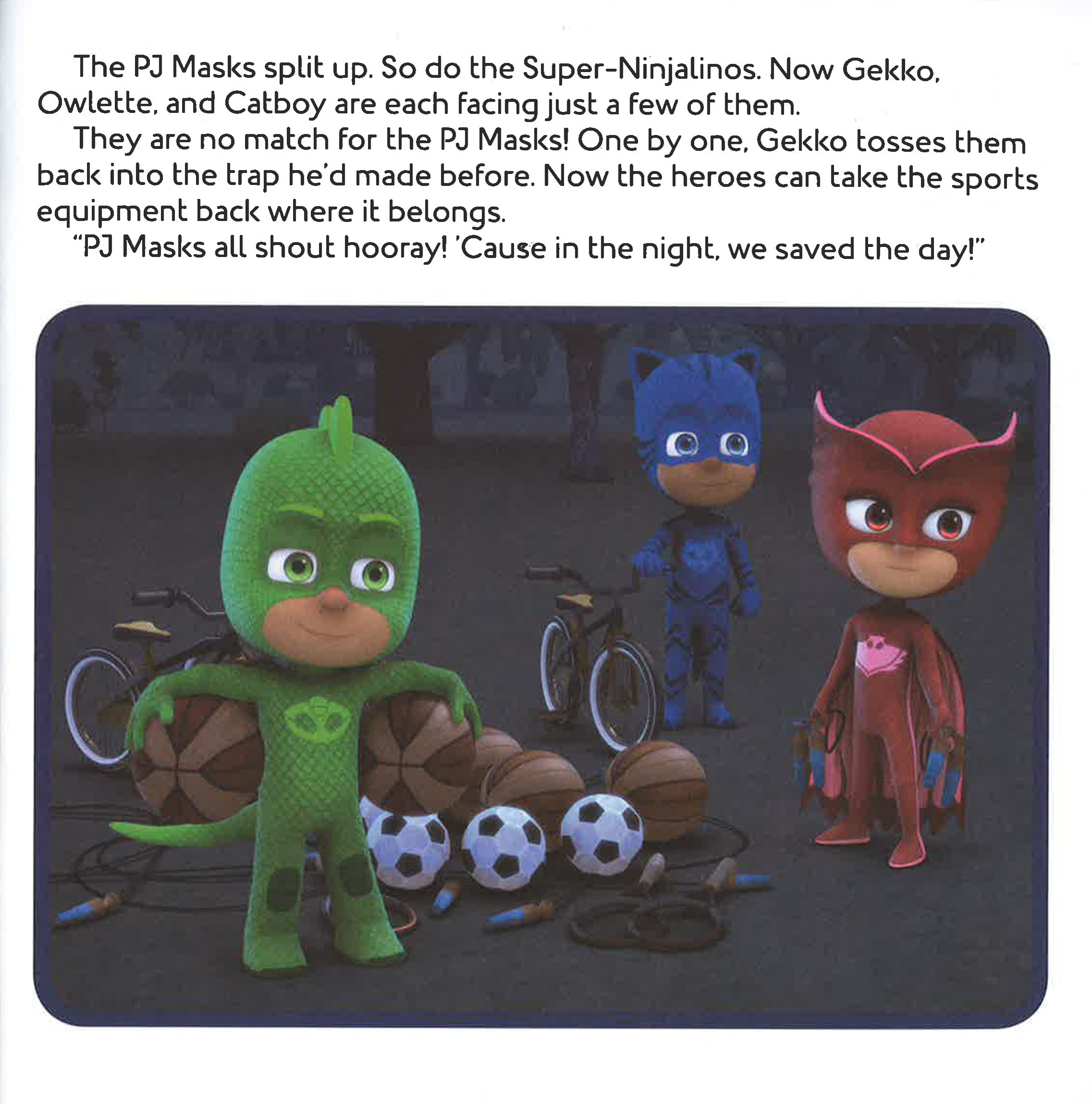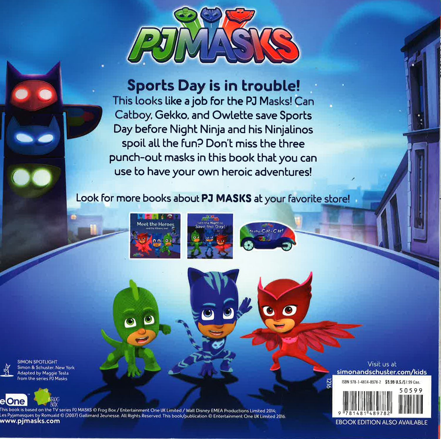 Catboy, Owlette, and Gekko must learn to work together in this 8x8 storybook that comes with three masks to punch out and wear, based on an episode of PJ Masks, the hit preschool series airing on Disney Junior! When Night Ninja steals all the sports equipment from Sports Day to make his Ninjalinos super strong, it's up to the PJ Masks to get it back! There's only one problem: Gekko is determined to prove that he's the strongest, so he won't let Catboy and Owlette help. Gekko learns that teamwork can make a strong hero even stronger! After the story, kids will love the three punch-out masks of Catboy, Owlette, and Gekko that they can use to have their own heroic adventures! PJ Masks (c) Frog Box / Entertainment One UK Limited / Walt Disney EMEA Productions Limited 2014