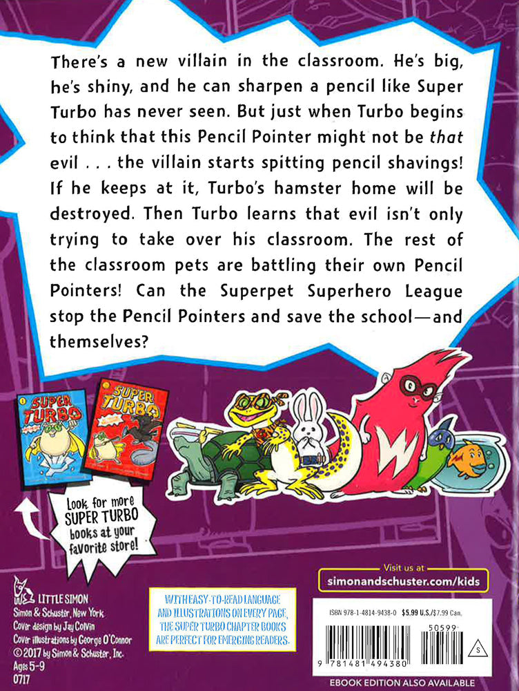 He's not just the class pet hamster, he's SUPER TURBO! Super Turbo battles the evil Pencil Pointer in this third book of the Super Turbo chapter book series. You know Turbo as the hamster sidekick from the Captain Awesome books. But ever wonder what actually goes on when the last school bell rings and Turbo is left to his own devices? He's SUPER TURBO and he's here to fight evil in and out of the classroom! In this third book, there's a new villain in the classroom. He's big, he's shiny, and he can sharpen a pencil like Super Turbo has never seen. And he stares at Turbo. All. Day. Long. But just when Turbo begins to think that the Pencil Pointer might not be that evil...the villain starts spewing pencil shavings! If he keeps at it, Turbo's hamster home will be destroyed. Then Turbo learns that evil isn't only trying to take over his classroom. The rest of the classroom pets are battling their own Pencil Pointers! Can the Superhero Superpet League stop the Pencil Pointers and save the school--and themselves? With easy-to-read language, illustrations, and comic panels on almost every page, the Super Turbo chapter books are perfect for emerging readers!