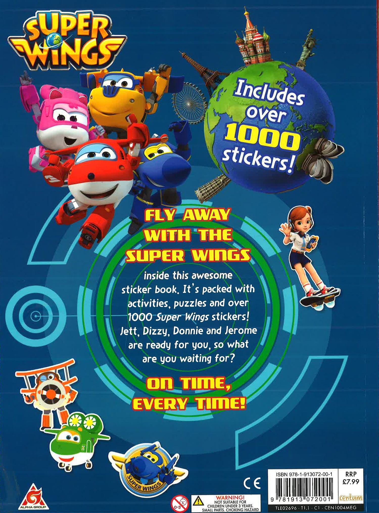 Fun-filled sticker activity book with puzzles, colouring and lots more - perfect for preschoolers. 13 colourful sticker pages including 1 page of sparkly holographic stickers. Featuring the popular Super Wings characters: Jett, Donnie, Dizzy, Jerome and Paul