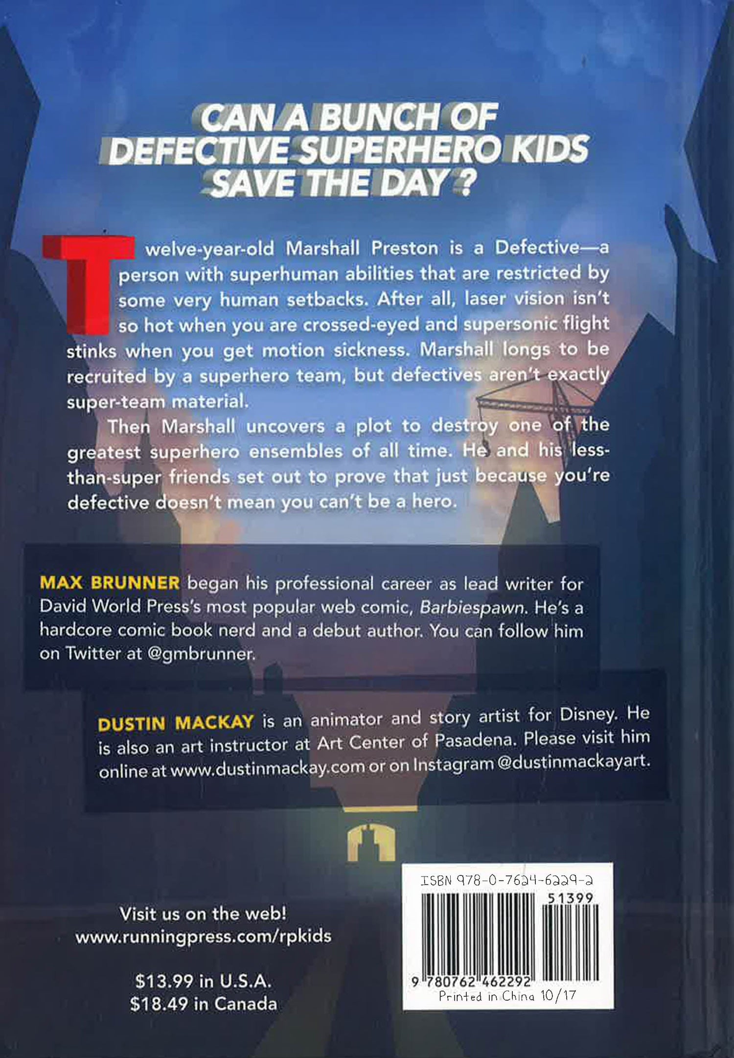 Twelve-year-old Marshall Preston is a Defective--a person with superhuman abilities that are restricted by some very human setbacks. While other kids are recruited to superhero teams, Marshall's stuck in seventh grade with a kid who can run at super speed but can't turn a corner, another with a radioactive peanut allergy that turns him into a swollen Hulk, and a telepath who reads everyone's thoughts out loud.