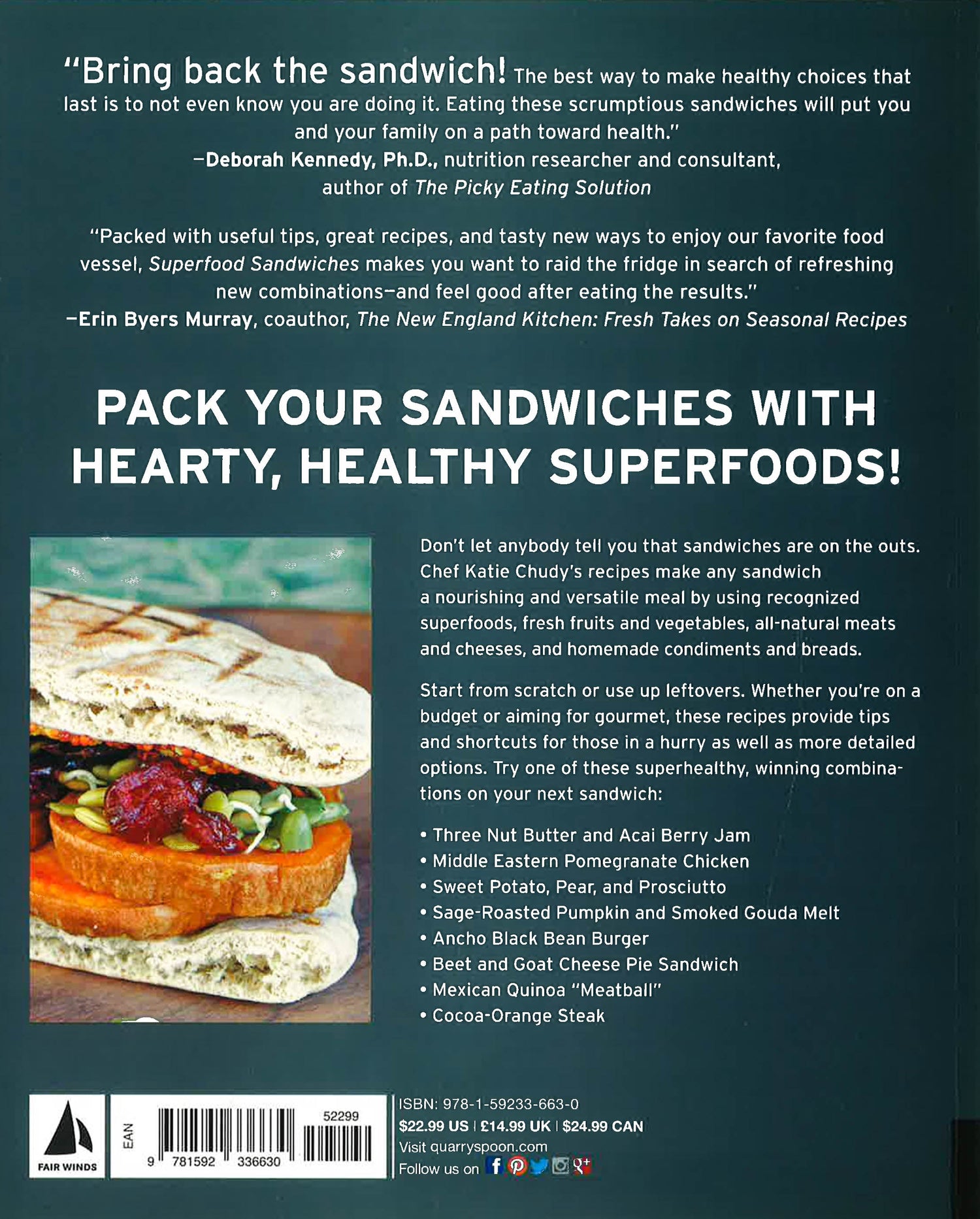 There's nothing better than chomping into a super-fresh sandwich with crusty bread, packed high with all your favorite nutritious fillings. Some say the sandwich is boring and classless - not the case for these sandwiches packed with superfoods.Superfood Sandwiches features recognized superfoods, fresh vegetables, fruits, all-natural meats and cheeses, and quality baked breads, making any sandwich a respectable and versatile meal.Start from scratch or use up some leftovers. Whether you're on a budget or aiming for gourmet, Chef Katie Chudy provides tips and shortcuts for those in a hurry as well as more detailed recipes and options, making some extra effort in the kitchen well worth it. Inside, you'll find easy and healthy recipes, such as:- Buttermilk Whole Wheat Bread - Tomatillo Yogurt Sauce - Beet Green and Pecan Pesto - Turmeric Chickpeas with Cardamon Spiced Apple Sandwich - Spinach and Zucchini Cornmeal Cakes with Spiced Goat Cheese - Argentinian Steak Sandwich with Kale Chimichurri - Sage Roasted Pumpkin and Smoked Gouda Melts - Edamame Fried Rice Veggie "burger" - Quinoa Crusted Eggplant Parmesan Sub - Swiss Chard, Fennel and Walnut Sandwich with Panchetta Chips and Saffron Yogurt SauceSuperfood Sandwiches revitalizes the concept of the everyday sandwich, drawing on global flavors and incorporating healthy superfoods that you want to eat. Celebrate the sandwich - a hearty meal option that is nutritious enough for any time of the day or night - while featuring fun and quirky recipes that will liven up your kitchen."Bring back the sandwich! The best way to make healthy choices that last is to not even know you are doing it. Eating these scrumptious sandwiches will put you and your family on a path toward health." - Deborah Kennedy, Ph.D., nutrition researcher and consultant, author of The Picky Eating Solution"Packed with useful tips, great recipes, and tasty new ways to enjoy our favorite food vessel, Superfood Sandwiches makes you want to raid the fridge in search of refreshing new combinations--and feel good after eating the results." - Erin Byers Murray, coauthor, The New England Kitchen: Fresh Takes on Seasonal Recipes"Meals just got a whole lot more nourishing! I love the myriad superfoods, textures, and nutrients that Katie presents. I want to try them all, starting with the Miso Carrot Salad Sandwich!" - Kelly Pfeiffer, author, Superfoods at Every Meal"Everyone loves sandwiches and superfoods are the future. Katie Chudy combines them gloriously into a sandwich orgy of a book of epic proportions." - Nookie Postal, chef + owner, Commonwealth restaurant and market, Cambridge, MA
