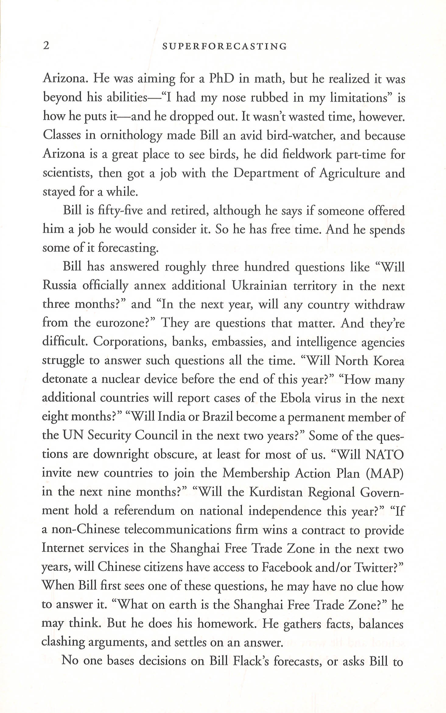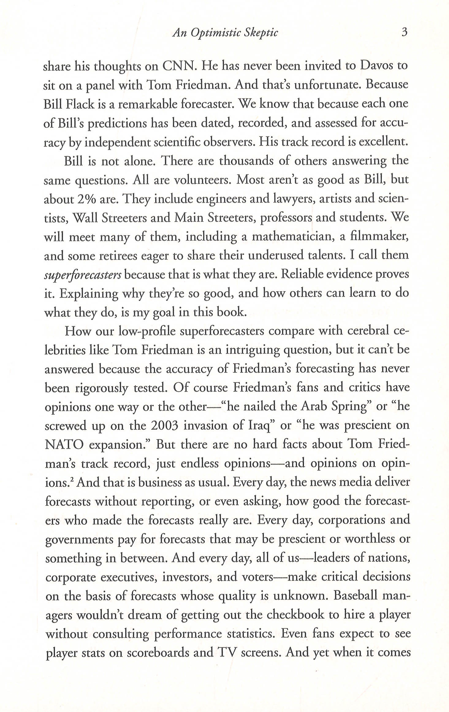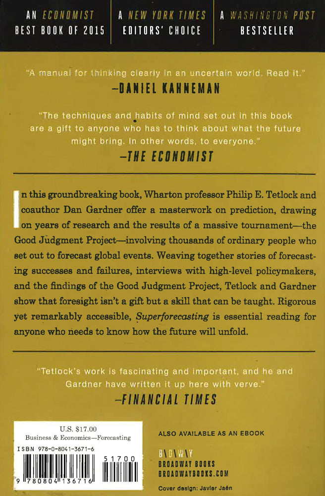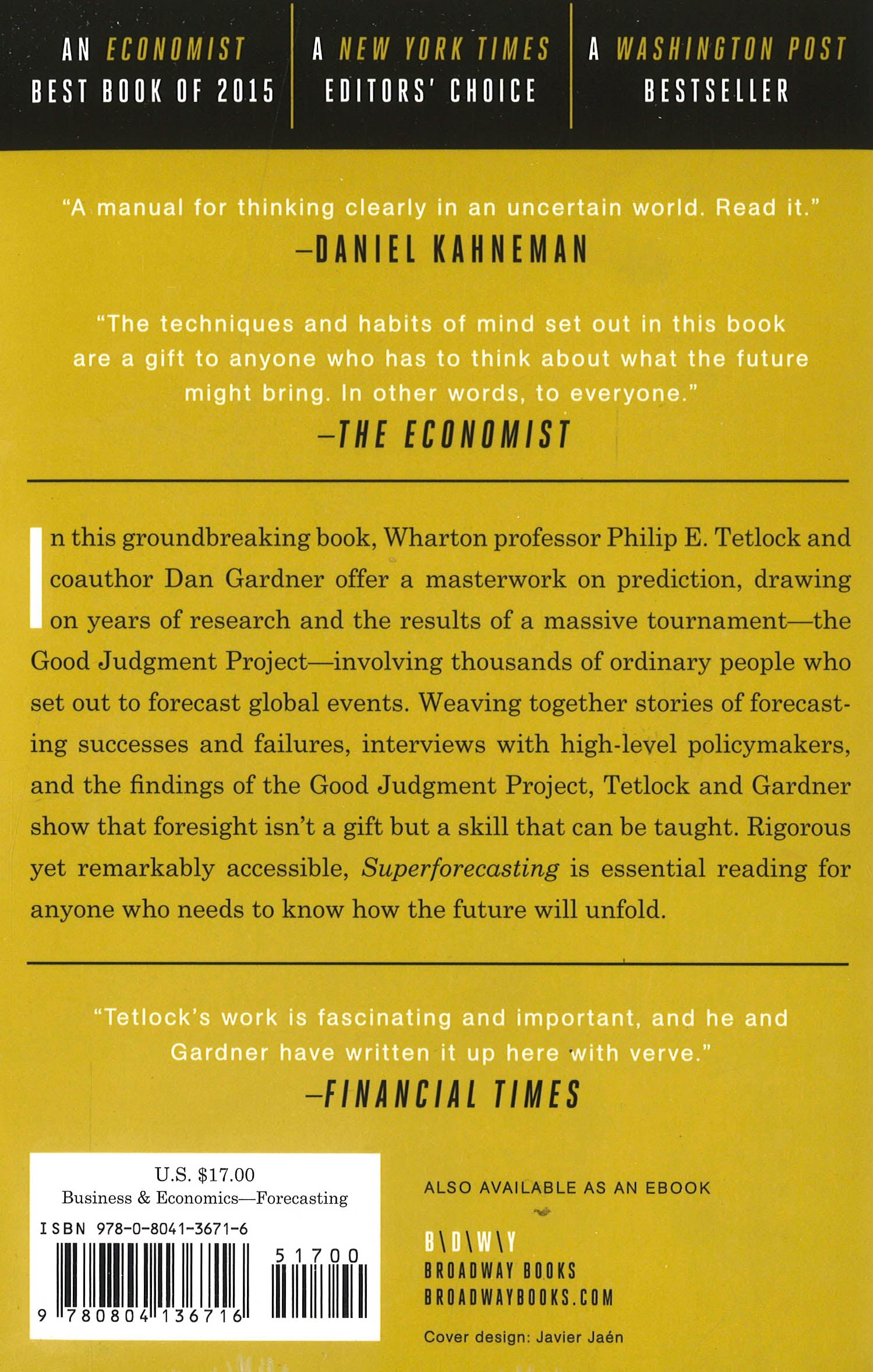 NEW YORK TIMES BESTSELLER - NAMED ONE OF THE BEST BOOKS OF THE YEAR BY THE ECONOMIST"The most important book on decision making since Daniel Kahneman's Thinking, Fast and Slow."--Jason Zweig, The Wall Street JournalEveryone would benefit from seeing further into the future, whether buying stocks, crafting policy, launching a new product, or simply planning the week's meals. Unfortunately, people tend to be terrible forecasters. As Wharton professor Philip Tetlock showed in a landmark 2005 study, even experts' predictions are only slightly better than chance. However, an important and underreported conclusion of that study was that some experts do have real foresight, and Tetlock has spent the past decade trying to figure out why. What makes some people so good? And can this talent be taught?In Superforecasting, Tetlock and coauthor Dan Gardner offer a masterwork on prediction, drawing on decades of research and the results of a massive, government-funded forecasting tournament. The Good Judgment Project involves tens of thousands of ordinary people--including a Brooklyn filmmaker, a retired pipe installer, and a former ballroom dancer--who set out to forecast global events. Some of the volunteers have turned out to be astonishingly good. They've beaten other benchmarks, competitors, and prediction markets. They've even beaten the collective judgment of intelligence analysts with access to classified information. They are superforecasters.In this groundbreaking and accessible book, Tetlock and Gardner show us how we can learn from this elite group. Weaving together stories of forecasting successes (the raid on Osama bin Laden's compound) and failures (the Bay of Pigs) and interviews with a range of high-level decision makers, from David Petraeus to Robert Rubin, they show that good forecasting doesn't require powerful computers or arcane methods. It involves gathering evidence from a variety of sources, thinking probabilistically, working in teams, keeping score, and being willing to admit error and change course.Superforecasting offers the first demonstrably effective way to improve our ability to predict the future--whether in business, finance, politics, international affairs, or daily life--and is destined to become a modern classic.