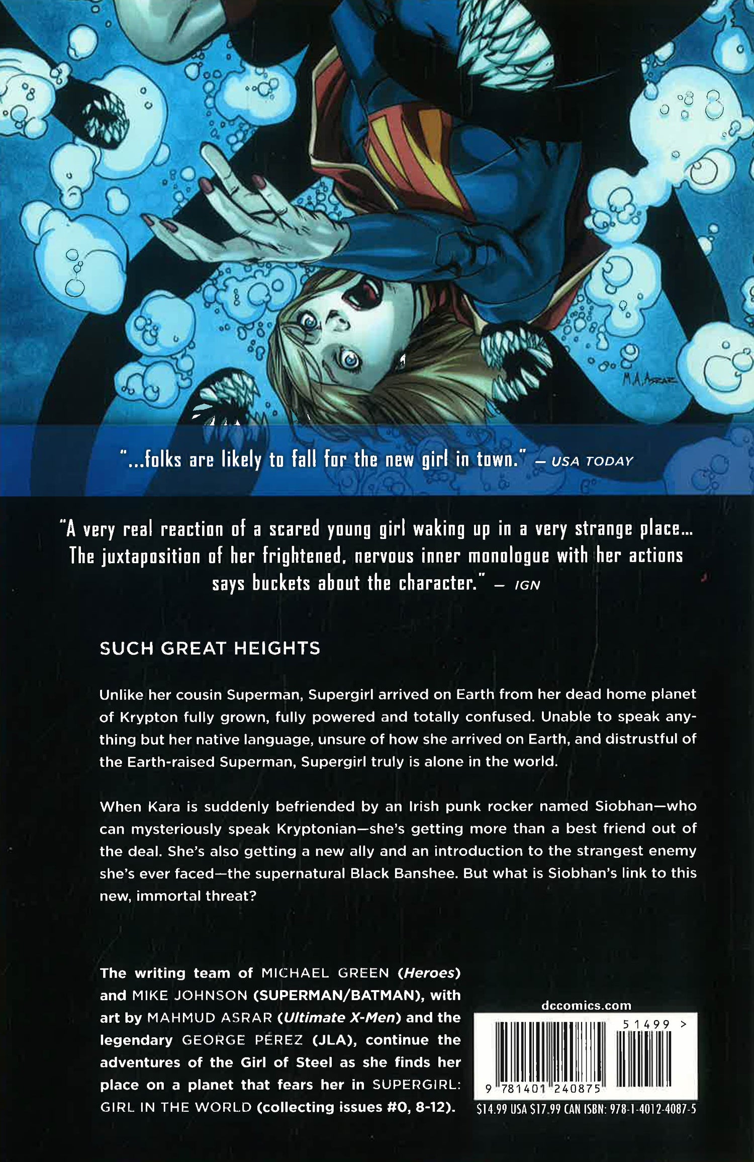 The writing team of Michael Green (Heroes) and Mike Johnson (SUPERMAN/BATMAN), with art by Mahmud Asrar (Dynamo 5) and George Pérez (JLA), continue the adventures of the Girl of Steel as finds her place on a planet that fears her in Supergirl: Girl in the World (collecting issues #0, 8-12).