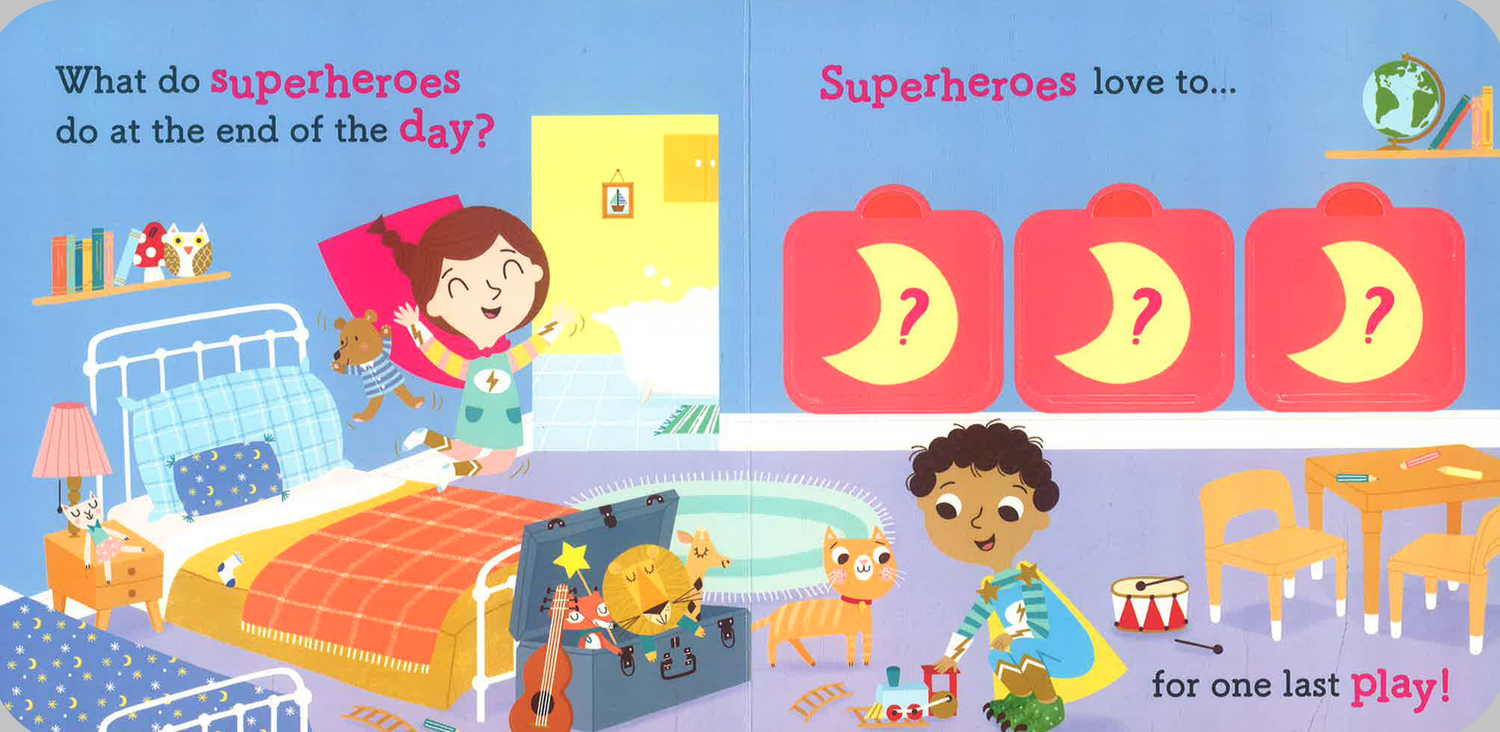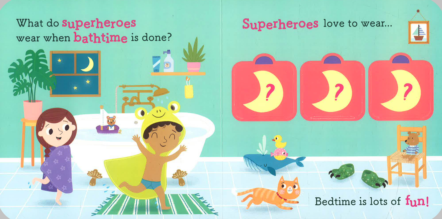 A 'going to bed' book for super toddlers! Reassure and encourage your child to develop a bedtime routine with this calming and helpful ready-for-bed book! Help the superhero toddlers as they get ready for bed. Do superheroes brush their teeth with a lollipop or a toothbrush? Do they wear their superhero costumes or their pyjamas to bed? By lifting the flaps to choose what happens next on each page, children help the superheroes learn all about developing a calm and confident bedtime routine in a reassuring and interactive way. This book is perfect for children who are taking their first big steps towards developing a bedtime routine with confidence.
