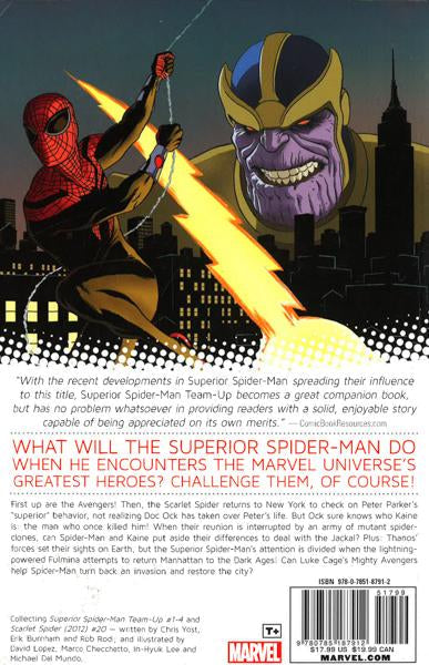What will the Superior Spider-Man do when he encounters the Marvel Universe's greatest heroes and villains? Challenge them, of course! And fi rst up is the Scarlet Spider! Kaine returns to New York to check on Peter's "superior" behavior, not realizing that Doc Ock has taken over Peter's life. But Ock sure knows who Kaine is...he's the man who once killed him! But when their reunion is interrupted by an army of mutant spider-clones, can Spider-Man and Kaine put aside their differences to deal with the Jackal? Plus, as Thanos' forces set their sights on earth, the Superior Spider-Man stands ready to defend his turf! And for months, Spider-Man has been capturing the members of the Sinister Six...but why? Is Doctor Octopus fi nally showing his true colors? Everything has been building to this! COLLECTING: SUPERIOR SPIDER-MAN TEAM-UP 1-4, SCARLET SPIDER 20 *This book may have remainder mark.